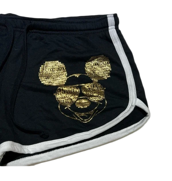 Disney Fans will love these beach shorts! Officially licensed women's Mickey Mouse beach shorts. These shorts come in black with a gold foil "Mickey Mouse" logo. Made from a blend of cotton and polyester.