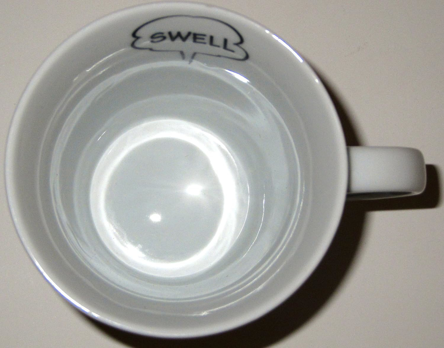 This mug has a boxy comic strip-like design with "SWELL" graphics. There is a word bubble inside the mug with the same sentiment.