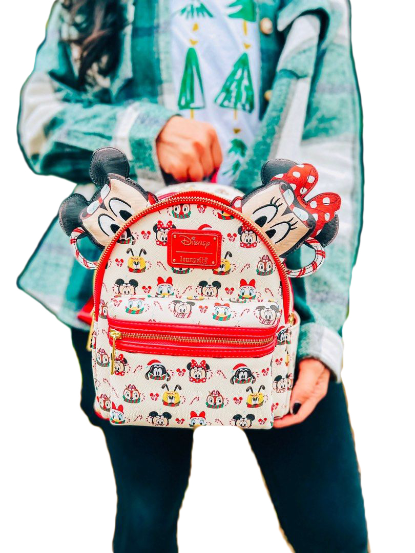 Exterior side pouch pockets and zipped front pocket Adjustable padded shoulder straps and hanging loop Interior lined with matching themed fabric Finished with the signature Loungefly metal badge Vegan friendly 100% official Disney Mickey and Minnie Loungefly bag