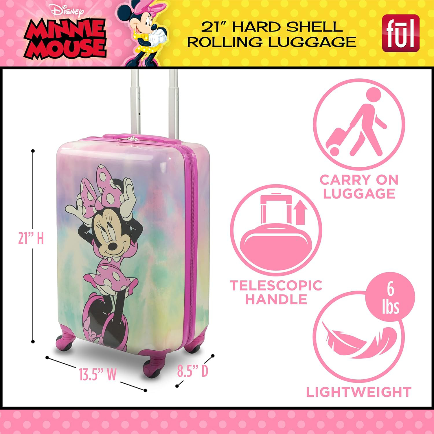 Give the perfect gift to the Disney fan in your life and keep your belongings conveniently and efficiently stored in one place while breezing through the airport or hotel lobby with this adorable Disney Minnie Mouse kid rolling luggage on wheels. Designed with a cute image of Minnie Mouse against a pastel pink background, this hard shell carry on luggage features 4 360 degree spinner wheels which allow for smooth travel over all types of textured surfaces, and the lightweight hard sided luggage with spinner wheels features a retractable pull handle so you can reach your destination without hassle. The hard case luggage features a sizable polyester-lined main zip compartment for easy packing, a zip wet dry compartment for personal essentials, and clothing compression straps to keep clothing from wrinkling. The light weight carry on luggage roller features a hard shell ABS plastic case which protects your luggage and is easy to spot clean to keep the carry on luggage with wheels looking stylish during travel. The travelling bag with wheels measures 21 H x 13.5 W x 8.5 D in inches, and weighs 6 lbs. Backed by a 5 year warranty.