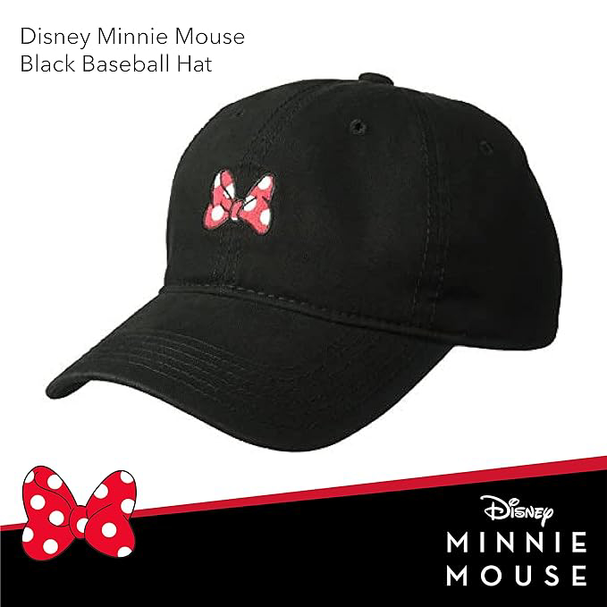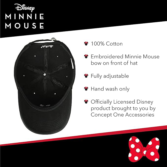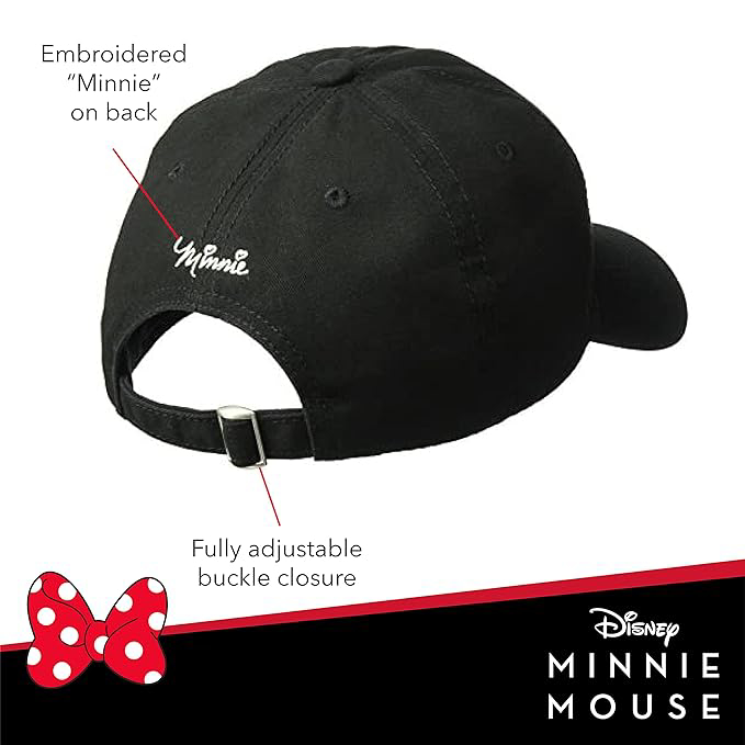 MINNIE MOUSE BASEBALL CAP: Stylish black adjustable hat with an embroidered image of Minnie Mouse's bows on the front of the cap, and a stitched Minnie signature on the back