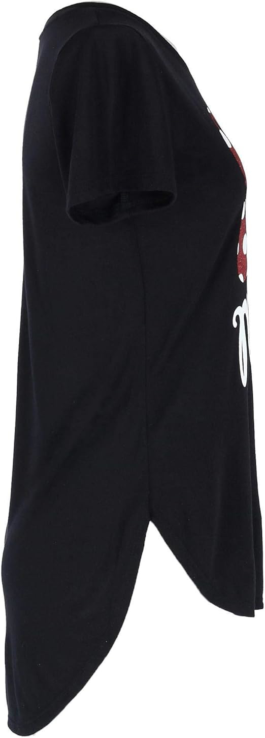 This fabulous short sleeve Minnie Mouse tee shirt features a red and white glitter print bow. The silky soft fabric will surround you with comfort day or night. The scoop neck top is longer in the back for a fashionable fit. This shirt is also available in girls sizes for a mommy and me look.