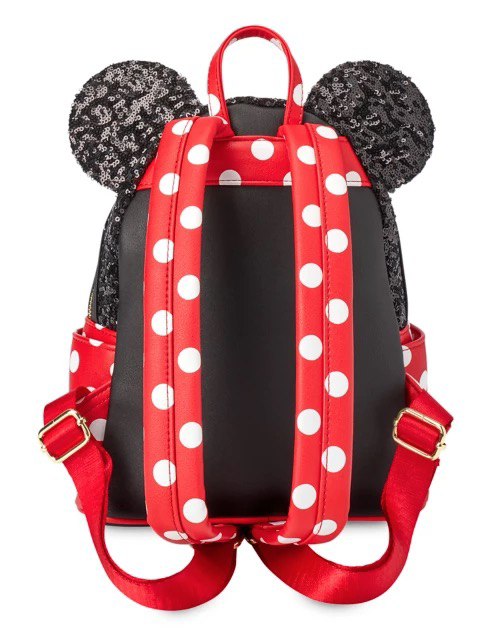 Style reaches iconic status with this dazzling Minnie Mouse sequin Loungefly mini backpack. Minnie's signature look is celebrated with black sequins and her cheerful red and white polka dots. Classic Loungefly elements include a fabric lining featuring vintage-style art of lovely Minnie, a double zipper main compartment, front zip pouch and more. Sure to bring the smiles every time you carry it, this bag feels like getting dressed up with a very best friend.