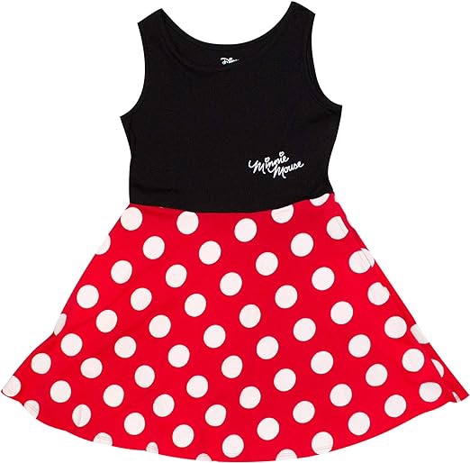 Little toddler girls will love this Minnie Mouse character dress. It is sleeveless, red with white polka dots. Perfect for a disney vacation or a hot summer day