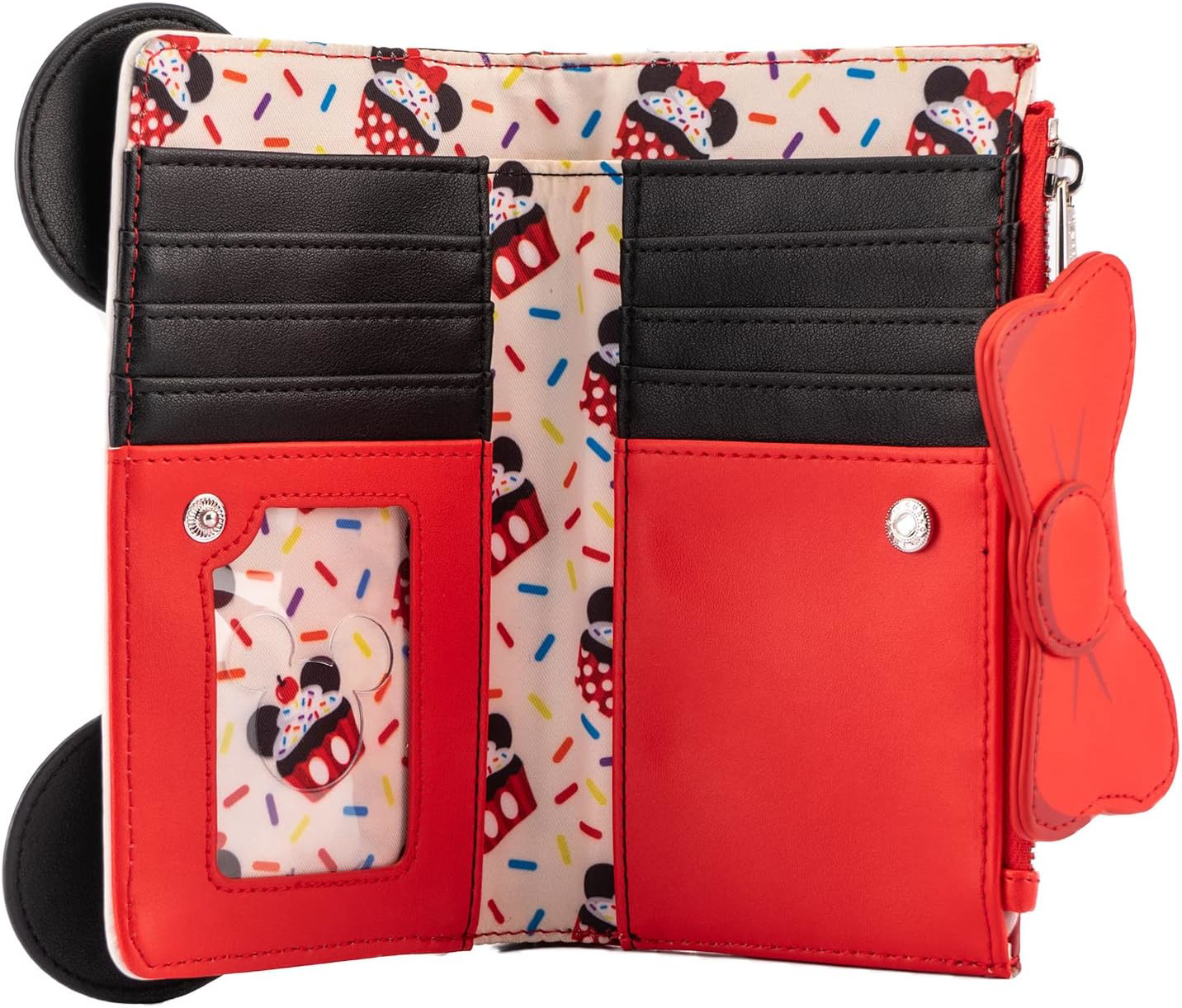 Even those trying to cut back on sweets will make an exception for this Minnie Mouse Sprinkle Cupcake Cosplay Flap Wallet! Any Disney Loungefly collector will be delighted to have this delectable collectable wallet. Down to the perfect placement of each sprinkle, this design is a must have. The Minnie Mouse Sprinkle Cupcake Cosplay Flap Wallet is made of vegan leather (polyurethane). Wallet snaps closed, has a zipper pocket and sturdy metal hardware, and features: applique, embroidered, and printed details. Take note of the coordinating pattern of the inside lining fabric. This wallet is an officially licensed Disney product.