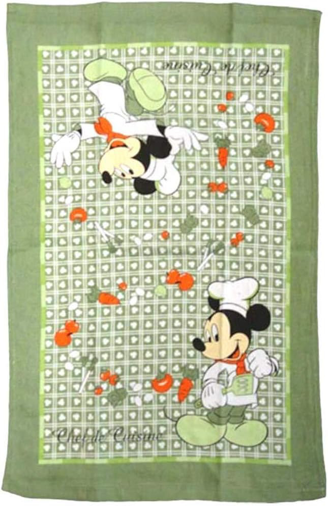 Disney Mickey and Minnie Mouse prints on three piece kitchen sets. Each set includes an Oven Mitt, Pot Holder, and Dish Towel. All three items are 100% cotton. The prints are only on the fronts of the items; the backs are solid color. The Oven Mitt is 7 inches x 13 inches. The Pot Holder is 8 inches x 8 inches. The Dish Towel is 25 inches x 16 inches.