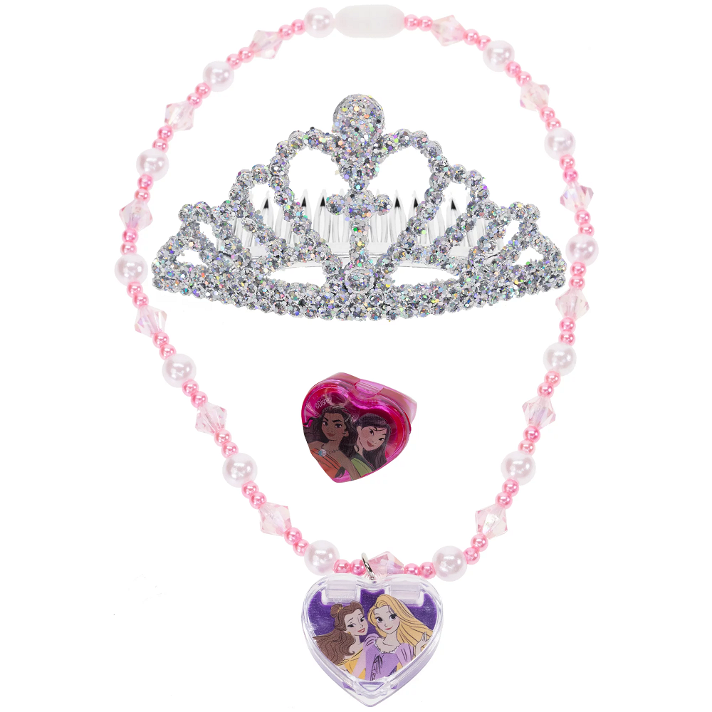 Amazing Disney Princess Glam Set! FABULOUS SET INCLUDES - pink necklace with lip gloss locket, ring with lip gloss pod and a pretend diamond tiara. This makeup play set are for little girls who love to play with Mama's makeup causing a total mess, we have just the solution with our make-up kits designed especially for them. With the little cosmetics, mothers can teach them the makeup skill, and convey a correct idea of appearances. Non-Irritating, Water-based formula makes these cosmetics Kids–Friendly and Safe for young ones aged 3 years old and up, including tweens and teens. Big fun for slumber parties or any pretend cosmetic playdate with Kids 3 and up. With lots to choose from, there's makeup for everyone.