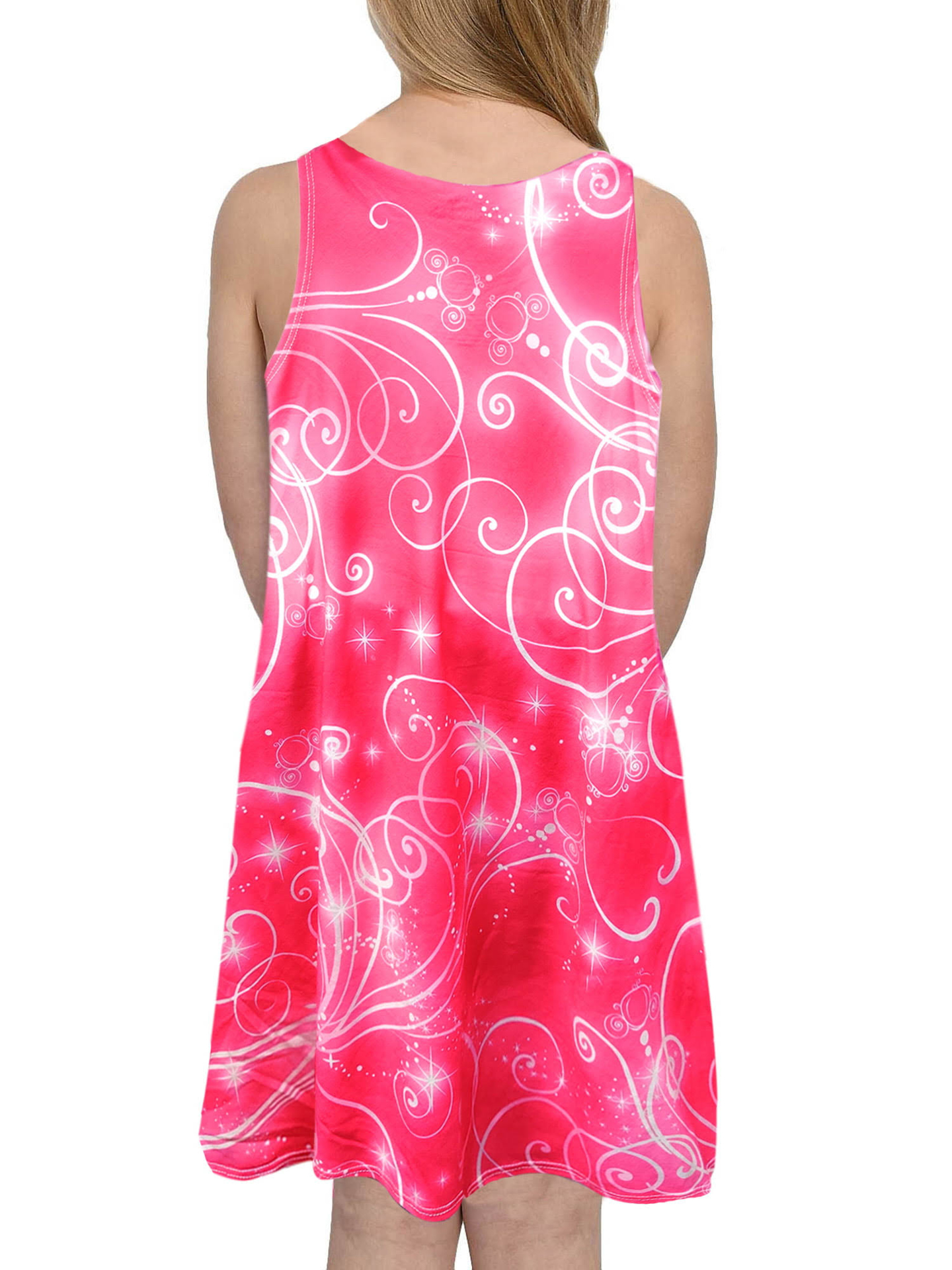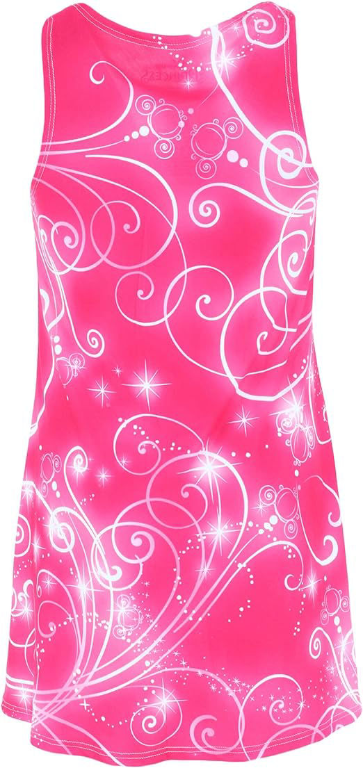 > Girls Disney Princesses Tank Top Dress - can be worn as a nightgown. > Features the Disney Princesses (Ariel, Aurora, Belle, Cinderella, Jasmine, Rapunzel, Snow White, and Tiana) on the front of the sublimation dress. The back continues stripes and stars sublimation print. > 96% Polyester, 4% Spandex. Soft & lightweight > Girls Sizing. Ages 4 - 10. > Dress measures approximately (laid flat).