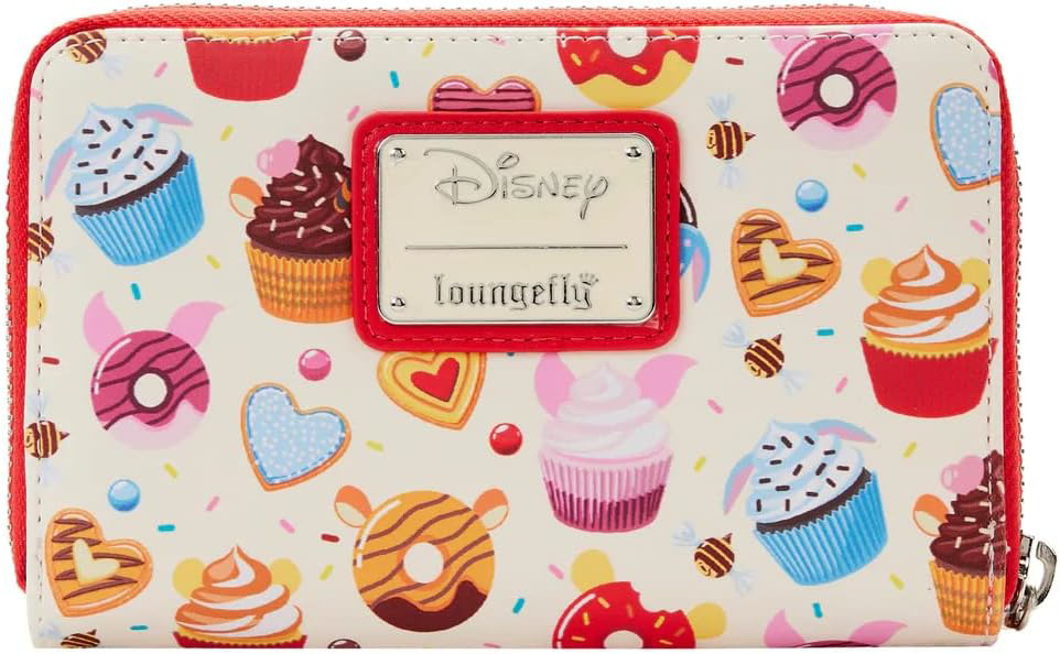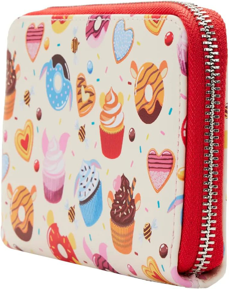Quick Overview Grab a picnic blanket and get ready for sweet treats in the Hundred Acre Wood. Take along this Loungefly Disney Winnie the Pooh Sweets Zip Around Wallet for sweet-as-honey adventures. An all-over-print carries a deliciously delightful motif of cookies, cupcakes, and doughnuts in colors associated with Winnie the Pooh, Piglet, Eeyore, and Tigger. A few bees are sprinkled in between as well. Inside, you’ll find 4 slots for holding cards and 1 clear slot for holding your ID. A die-cut candy shape adds a delectable touch. It’s perfect for all your Disney adventures—or for turning everyday outings into sweet and memorable moments. The Loungefly Disney Winnie the Pooh Sweets Zip Around Wallet is made of vegan leather (polyurethane). Wallet zips closed, has shiny silver-colored metal hardware, and features print details. Take note of the coordinating pattern of the inside lining fabric. This wallet is an officially licensed Disney product. Wallet Dimensions: 6”W x 3.75”H (Width is measured across the bottom of the wallet.) Patterns will vary with all-over-print styles. Not every piece will look identical nor will every piece be an exact match as to what is pictured online.