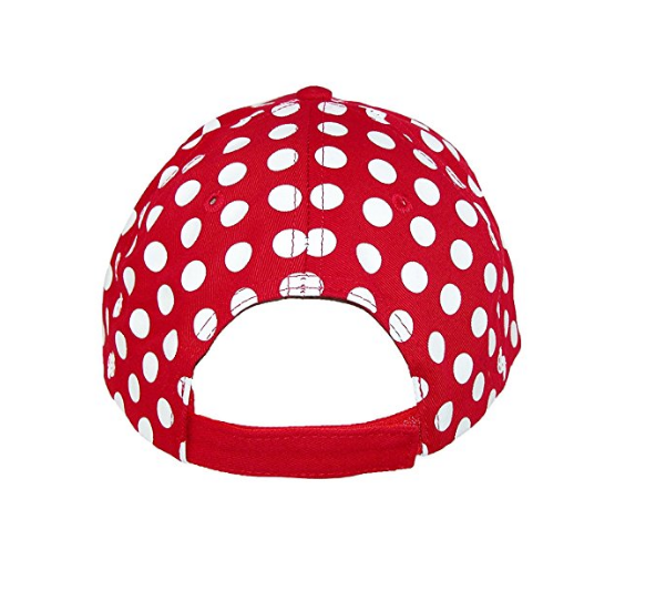 Walk the town in style in this Minnie Mouse polka dot baseball hat. It features white dots on top of the red cap with her famous bow on the front. The hat is one size fits most up to 23 inches. Completely adjustable with a hook and loop closure for a secure fit.