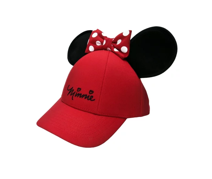 Features a Red polka dot bow with black soft cotton ears and embroidered "Minnie" on the front. Adjustable snap-back closure. 100% Cotton. Very comfortable to wear. Officially licensed Disney merchandise. For women, ladies. One size fits most.
