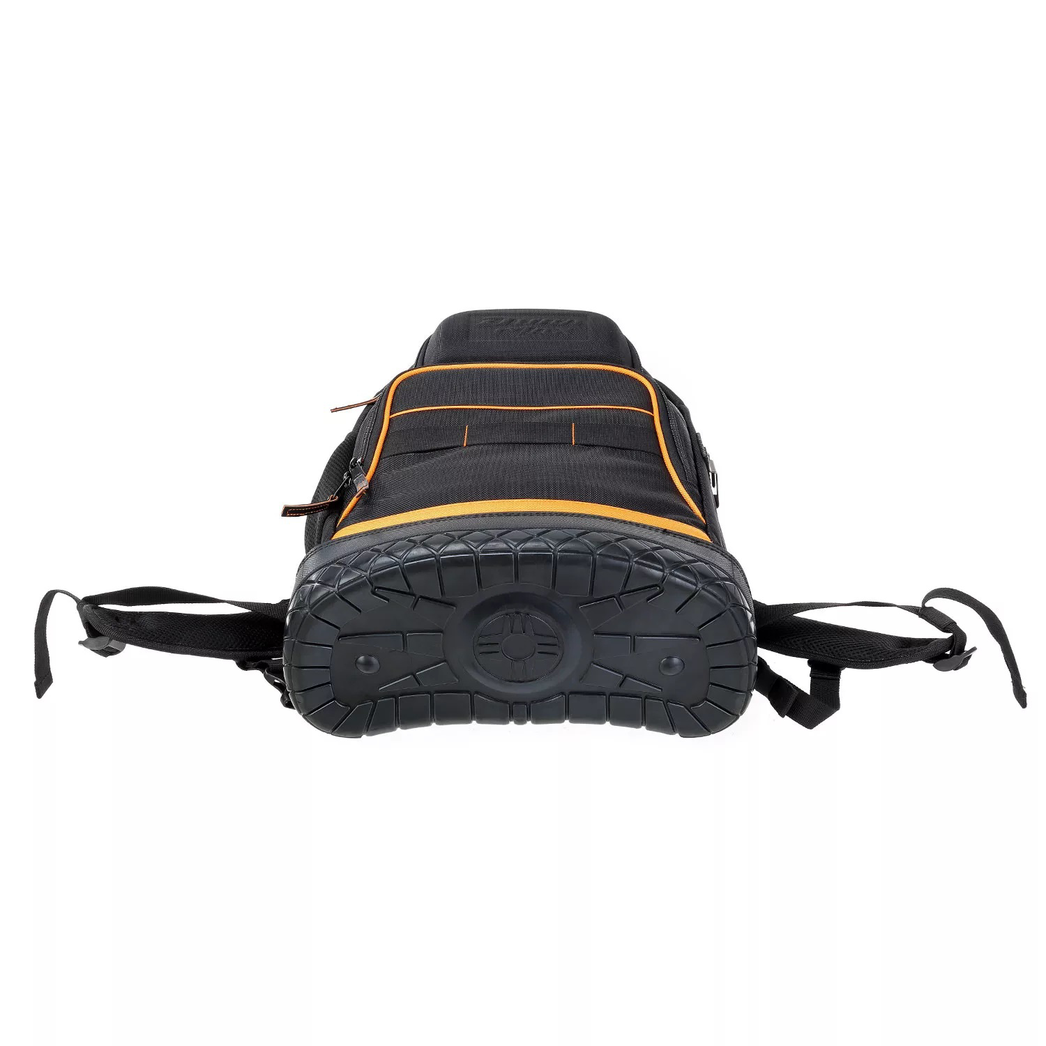 The DuraMax Tool Backpack features reinforced construction with 2-ply 1680 denier poly fabric and a YKK zipper. 26 assorted pockets are designed to hold a wide range of tools and supplies for many different trades. The EVA-molded case is ideal for carrying your eyewear, phone and other items that you need to make it through the day. A Neoprene storage sleeve can hold up to a 17" laptop while 8" tall elastic mesh external pockets are just right for a water bottle or a drink of choice. Store easy-access tools on the multi-purposr utility clip. Attach tape measures, drills and a wide variety of belt clip tools. The waterproof plastic bottom provides added protection on rough and jagged surfaces.