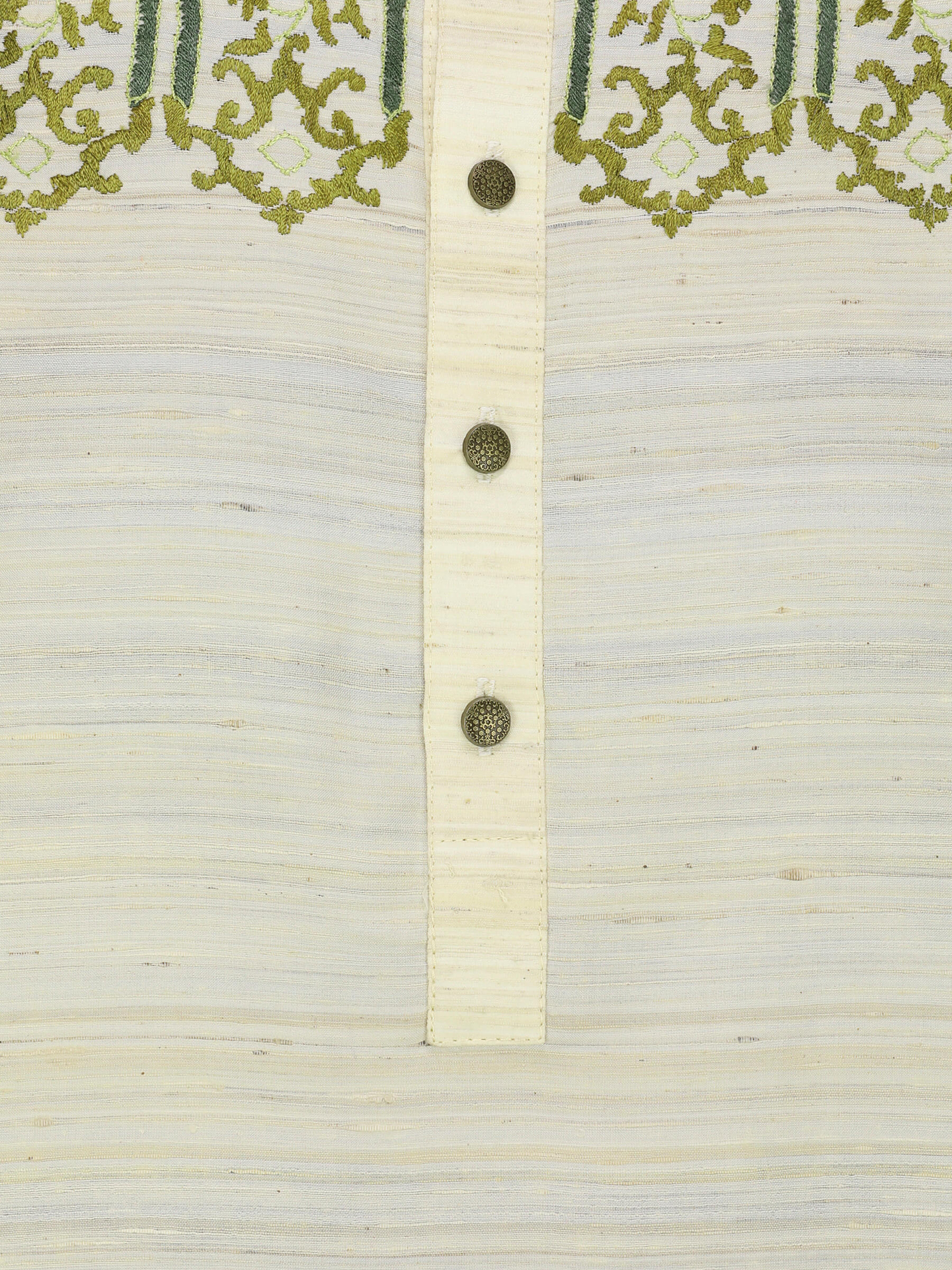 Ecru endi silk panjabi with brown, black and sage green embroidery.