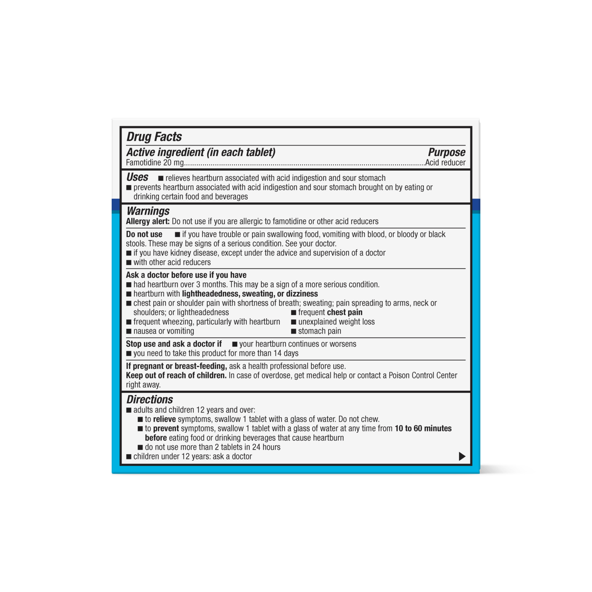 Compare to Maximum Strength Pepcid® AC active ingredient. Just one tablet of Maximum Strength Famotidine Tablets, 20 mg prevents and relieves heartburn associated with acid indigestion brought on by eating and drinking certain foods and beverages. This gluten free heartburn medicine is intended for adults and children 12 years and over. Maximum Strength Famotidine Tablets, 20 mg helps prevent meal-induced heartburn when taken at least 10-60 minutes before eating.