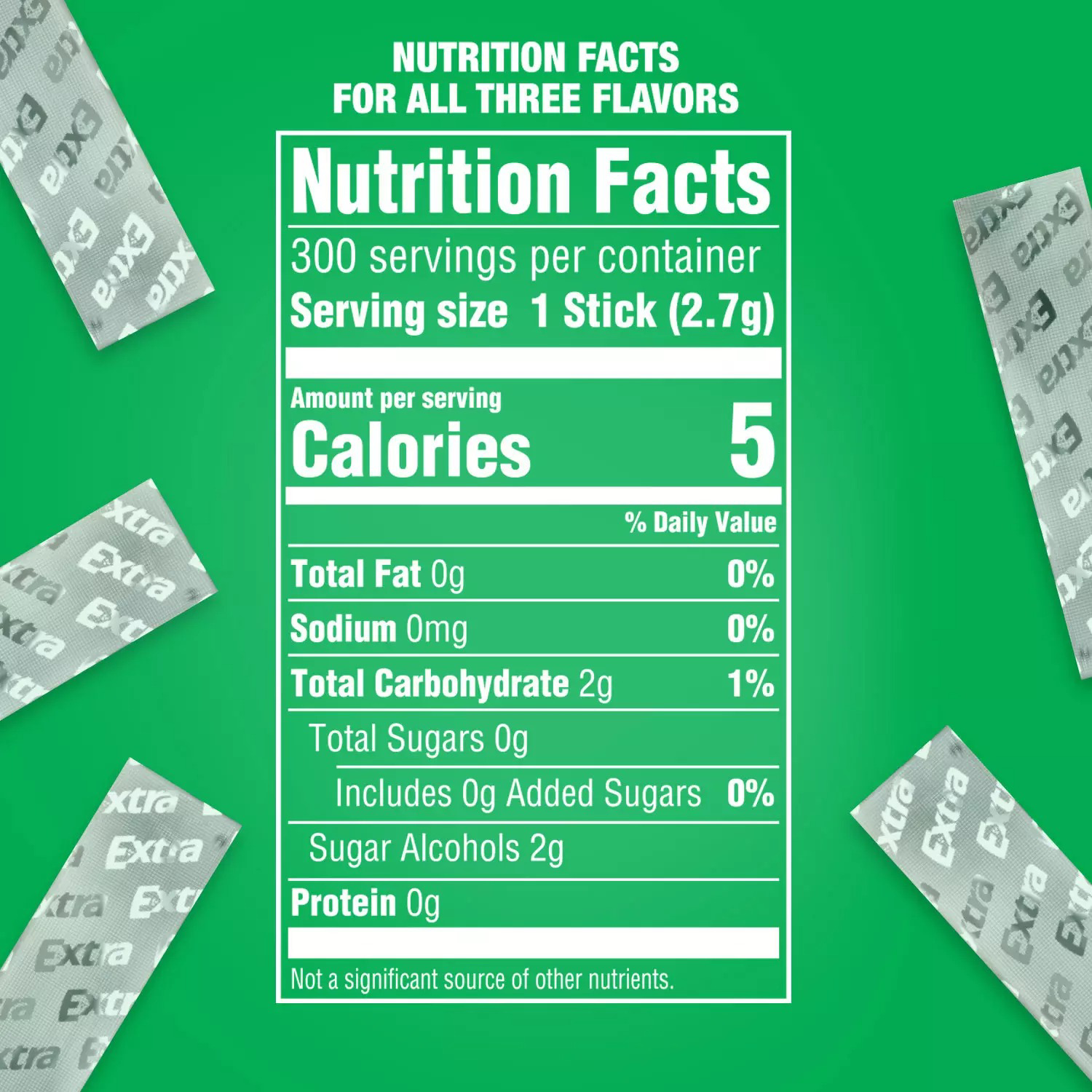 EXTRA knows: When you give EXTRA, you get extra. With a total of 300 sticks in this sugar-free mint gum variety pack, you have unlimited ways to share the joy of your favorite chewing gum. This bulk gum variety pack features 20 packs of everyone’s favorite EXTRA mint gum flavors with 6 Peppermint, 7 Polar Ice, and 7 Spearmint chewing gum packs. Each pack includes 15 individually wrapped sticks of bold mint gum flavor, making it easy to enjoy fresh breath on the go. EXTRA Sugar-Free Gum gives you a long-lasting flavor for any occasion. Give a piece to your co-pilot on your next road trip, stock up with this bulk gum variety pack for the office, or hand it out to your family when they need something fresh to get their day started. Fill the pantry with bulk gum and never miss a moment to give EXTRA. Stock up on chewing gum for home or the office so you always have breath-freshening flavor on hand. Keep a pack of EXTRA sugar-free gum at your desk for a delicious way to help you stay focused. Find crisp, invigorating refreshment from head to toe with EXTRA Sugar-Free Gum. When you give EXTRA, you get so much more in return.