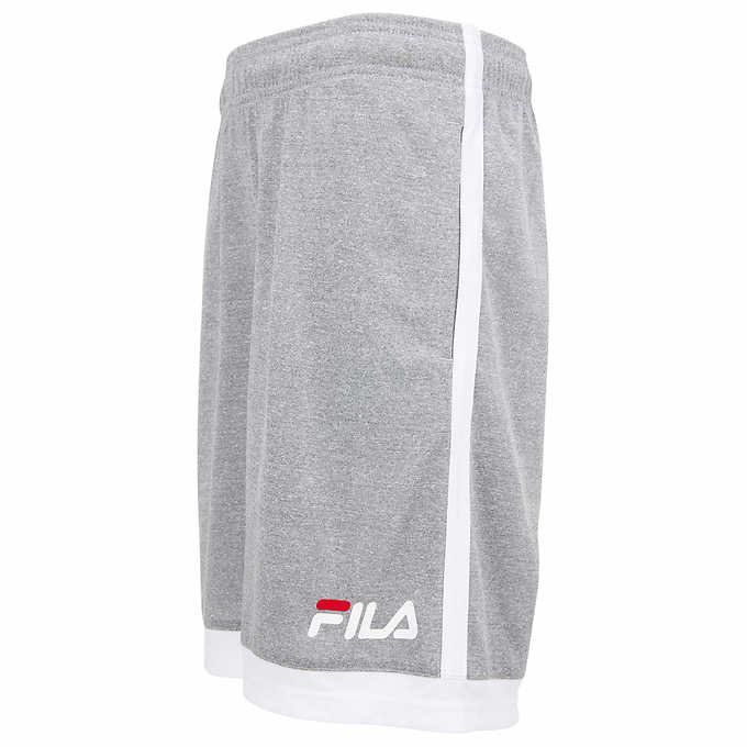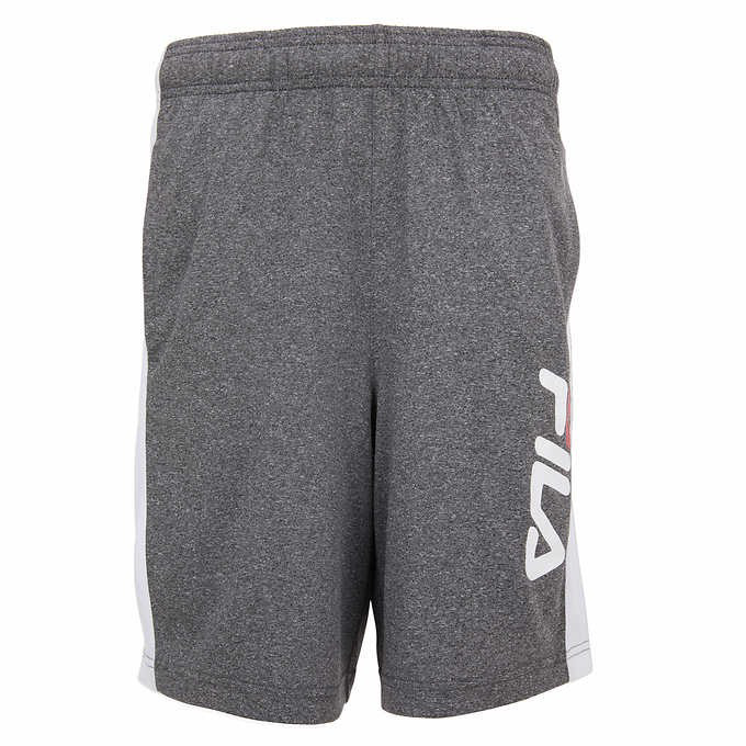 Color(s): dark gray and light gray. Set includes 2 pairs of shorts. Dark gray short with white mesh inset and brand logo on front left leg. Light gray short with white stripes on the sides/hem and brand logo at bottom left leg. Internal draw cords. Side seam pockets. Made in China.