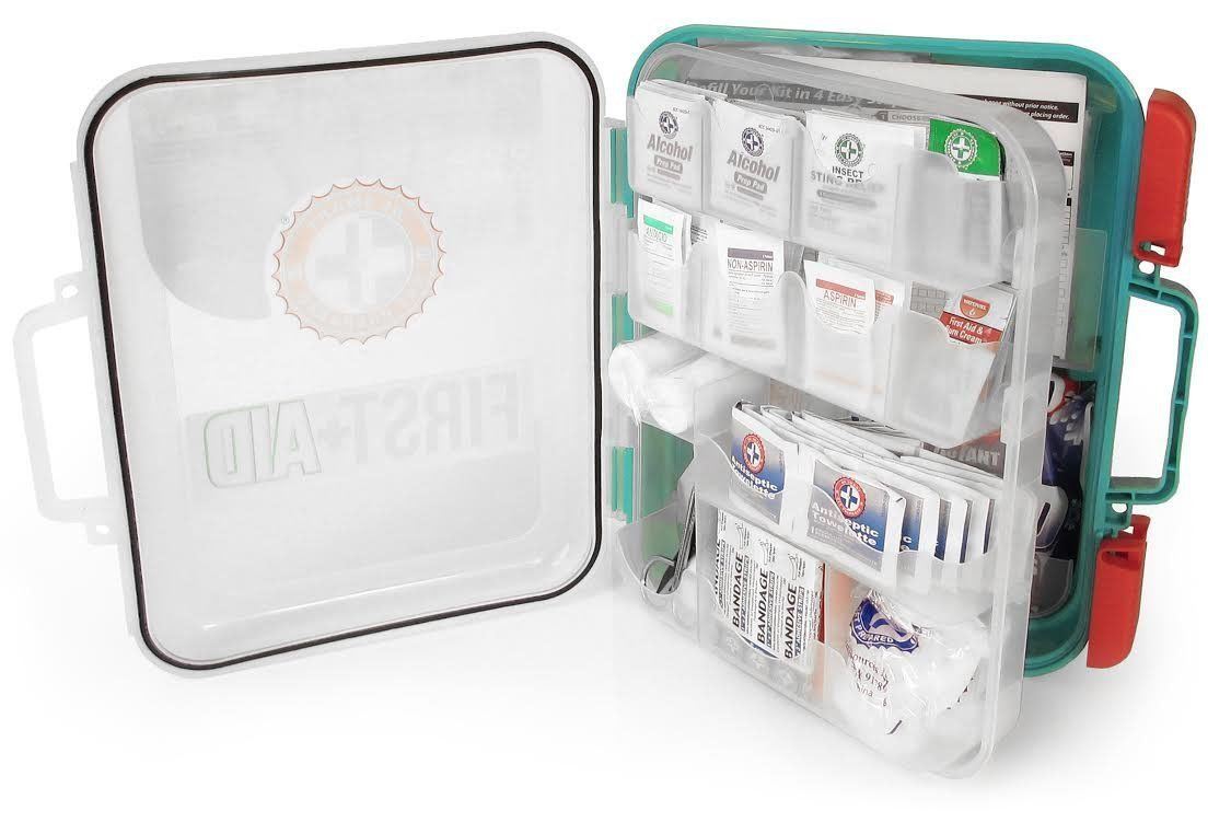 The Be Smart Get Prepared First Aid Kit complies or exceeds all OSHA guidelines for small businesses and meets ANSI type I and II requirements. It is in a hard carrying case with more storage space inside and a multi-compartment organizer. It can be carried around for portability or mounted on a wall in a central location. Contents: 21 antiseptic towelettes 36 alcohol prep pads 6 sting relief pads 6 antibiotic ointment packets 6 burn cream ointments 10 antacid tablets 10 aspirin tablets 10 non-aspirin tablets 1 instant cold compress 6" x 9" 1 English First Aid guide 1 Spanish First Aid guide 20 adhesive bandages 1" x 3" 50 adhesive bandages 3/8" x 1-1/2" 60 adhesive bandages 3" x 3/4" 10 butterfly closures bandages 18 wound closure strips 1/4" x 1-1/2" 2 gauze rolls 2" x 4.1 yards 2 eye pads 8 sterile gauze pads 2" x 2" 4 sterile gauze pads 4" x 4" 1 sterile trauma pad 5" x 9" 30 cotton tip applicators 1 adhesive tape roll 1" x 5 yards 5 finger splints 1 triangular bandage 40" x 40" x 56" 1 tweezer 1 metal scissor 4 examination gloves.