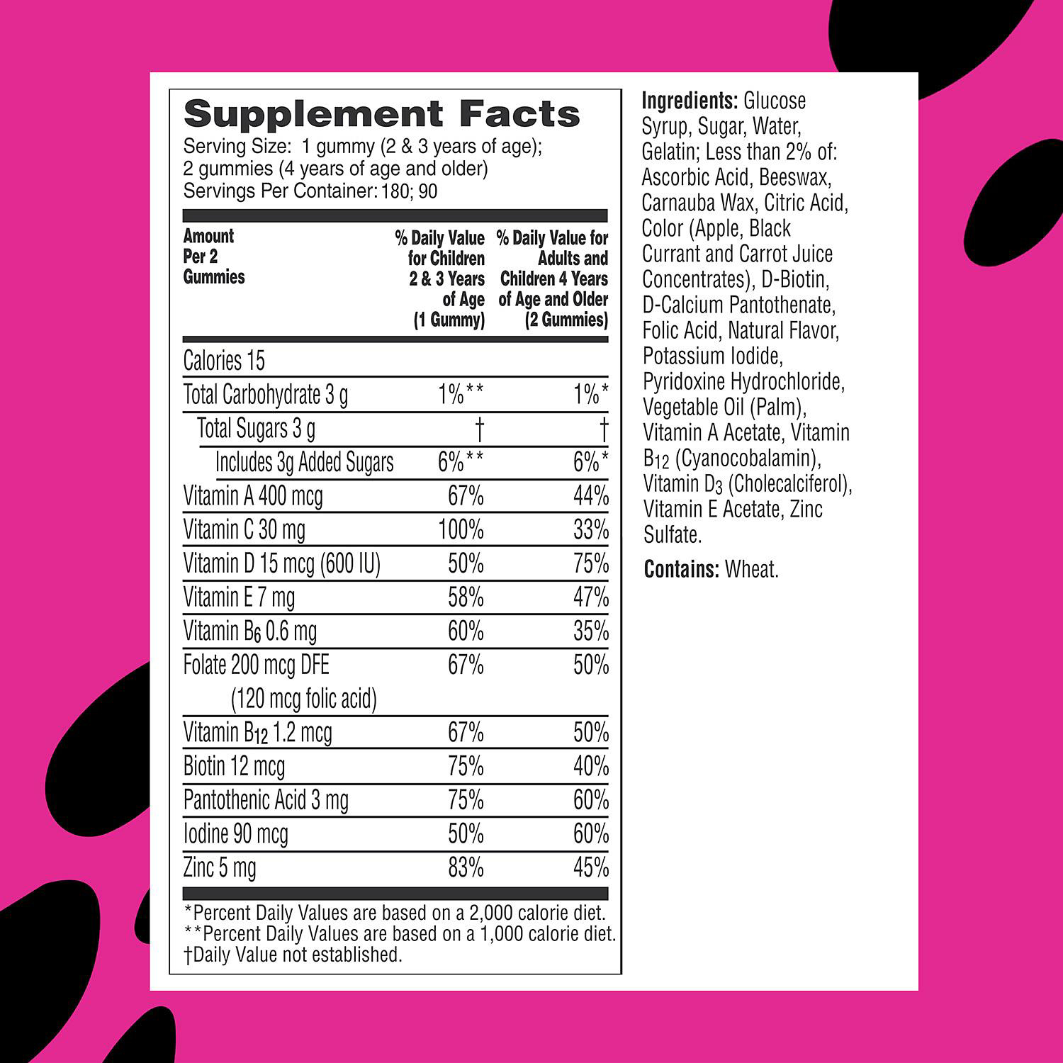 Flintstones Complete Multivitamin satisfies the daily needs of toddlers and adolescents over the age of two with a specially formulated combination of over a dozen vitamins in a delicious gummy package. Flintstones Children's Complete Multivitamin Gummies fill in the gaps between an otherwise healthy diet and an active lifestyle and ensure that your kid is getting everything he or she needs to grow up happy and healthy. Vitamin D and calcium team up to fortify bone strength; vitamin C is supported by vitamin E and zinc to make sure their immune system has what it needs; vitamin B6, vitamin B12, biotin, and pantothenic acid help maintain consistent energy levels; and vitamins A, C, and E combine to improve and maintain eye health.