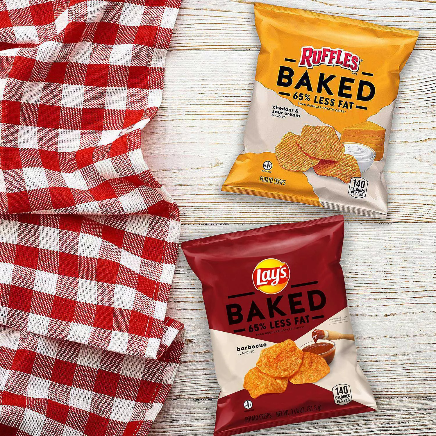 Frito-Lay variety packs include multiple bags of its most-loved flavors. This pack includes five varieties to choose from 8 bags of Lay’s Original Potato Crisps, 8 bags of Cheetos Crunchy Cheese Flavored Snacks, 6 bags of Lay’s Barbecue Flavored Potato Crisps, 4 bags of Lay’s Sour Cream & Onion Flavored Potato Crisps, and 4 bags of Baked Ruffles Cheddar & Sour Cream Flavored Potato Crisps.