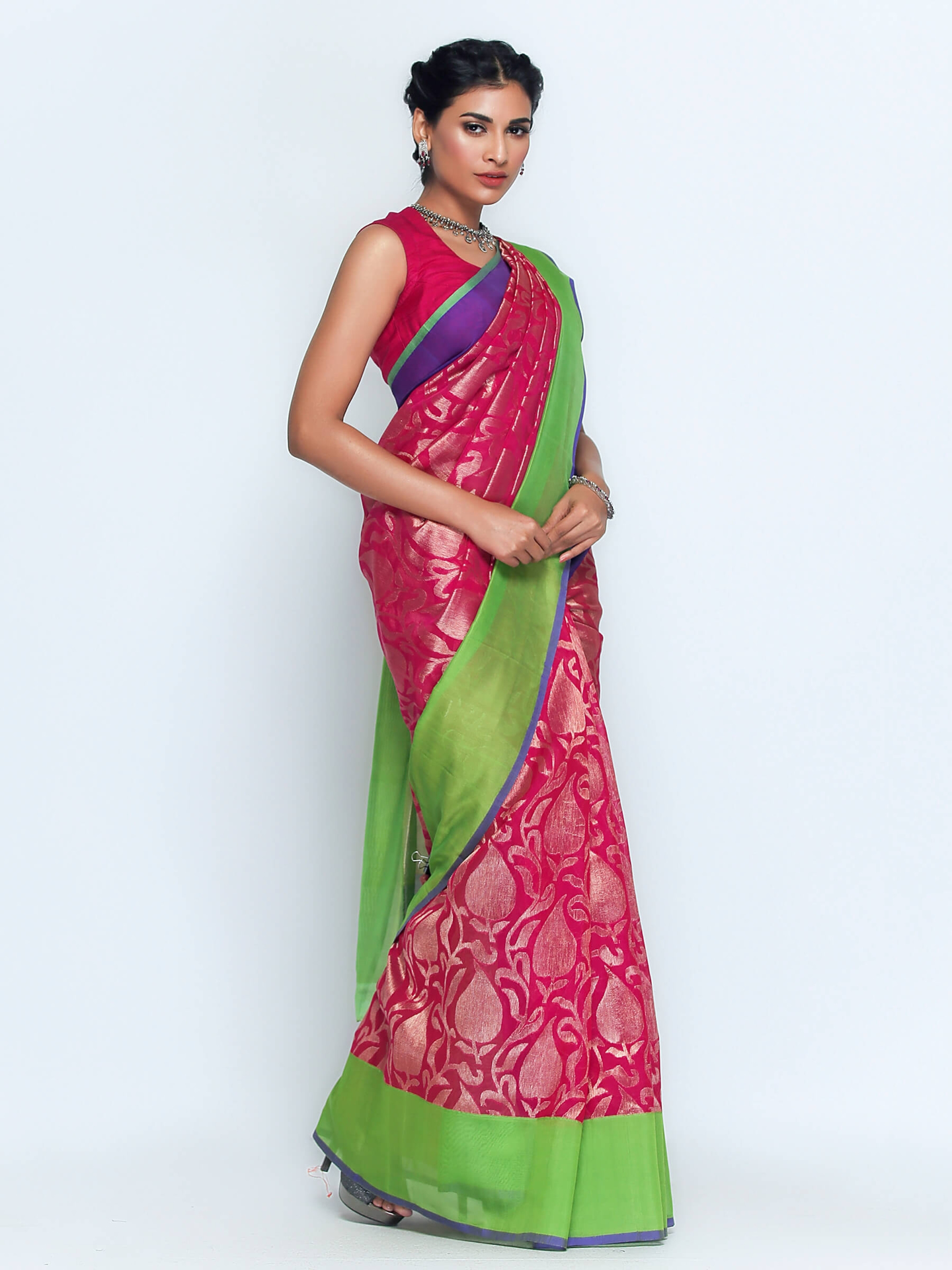 Fuchsia and golden weaved Sirajganj half silk opera saree with lime green and purple weaved aanchal. Comes with matching unstitched blouse piece. Pair with jewelleries and other accessories.