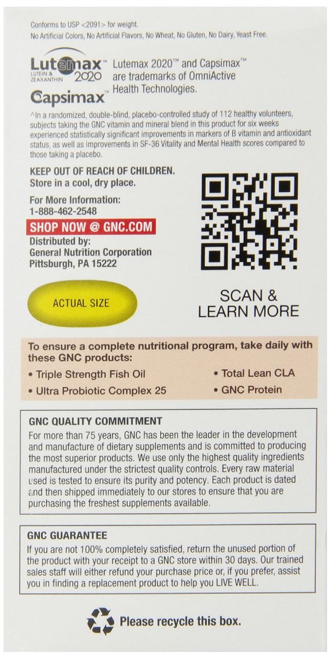 GNC Quality Commitment For more than 77 years, GNC has been the leader in the development of superior nutritional supplements. Our products are produced using only fresh, high-quality ingredients and are manufactured under the strictest quality controls. Conforms to USP <2091> for weight. Meets USP <2040>disintegration. Lutemax 2020™ Lutein & Zeaxanthin 1-888-462-2548 †Compared to the leading women's multivitamin brand. ^Ultra Concentrated Technology: Using cutting-edge product development processes, GNC Women's Ultra Mega One Daily Multivitamin was developed to deliver more nutrients in one standard size pill for greater benefits. �Emerging research suggests that adequate daily vitamin D intake may play a role in supporting breast and colon health. ��This product is endorsed by the GNC Medical Advisory Board. This team of esteemed physicians utilizes their extensive medical knowledge and experience to aid in the creation of GNC premium products, helping you to achieve optimal health through comprehensive nutritional support so you can live your best life! *These statements have not been evaluated by the Food and Drug Administration. This product is not intended to diagnose, treat, cure or prevent any disease. |