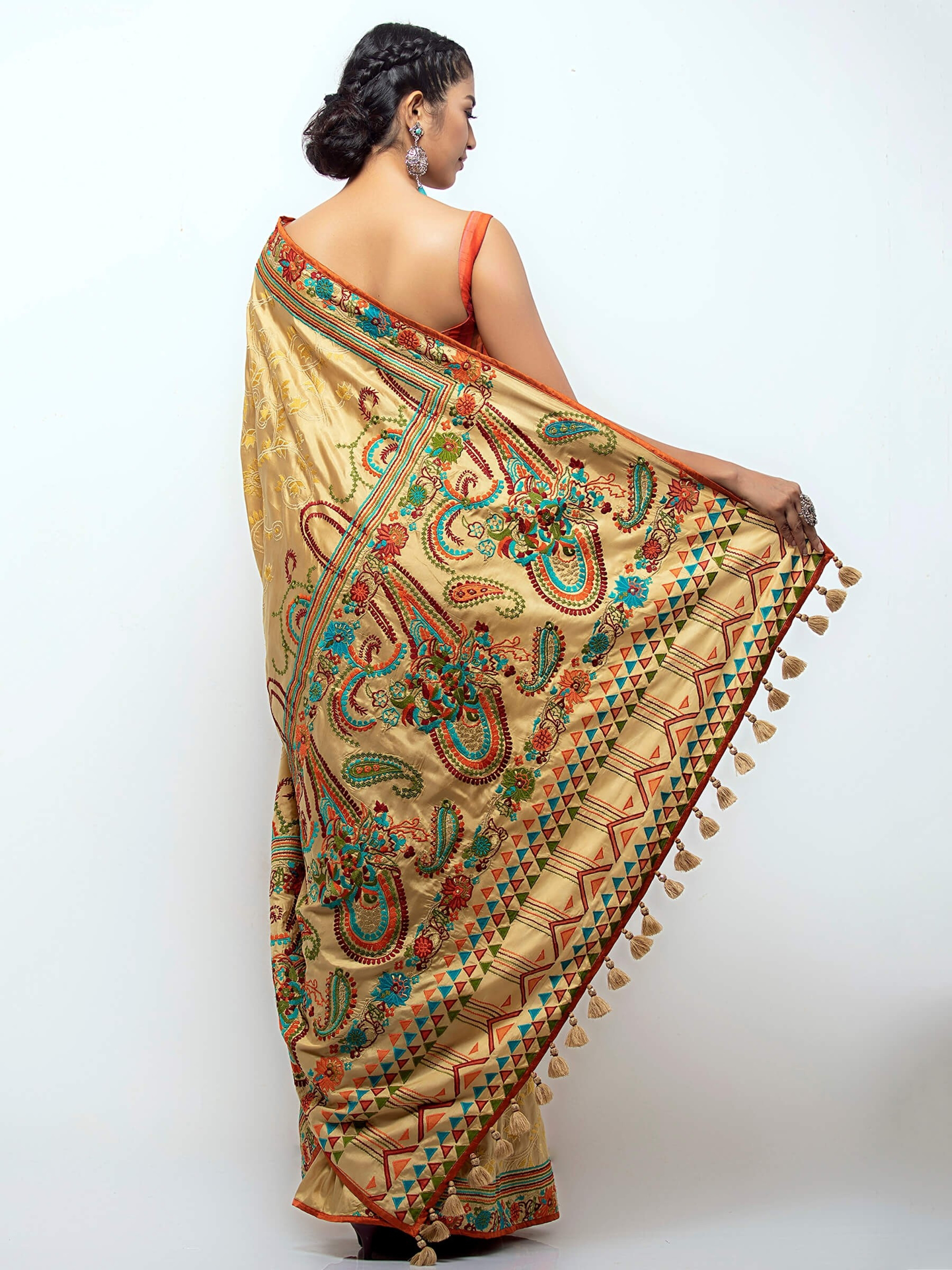 Golden silk saree with multicolour embroidery. Comes with matching unstitched blouse piece.