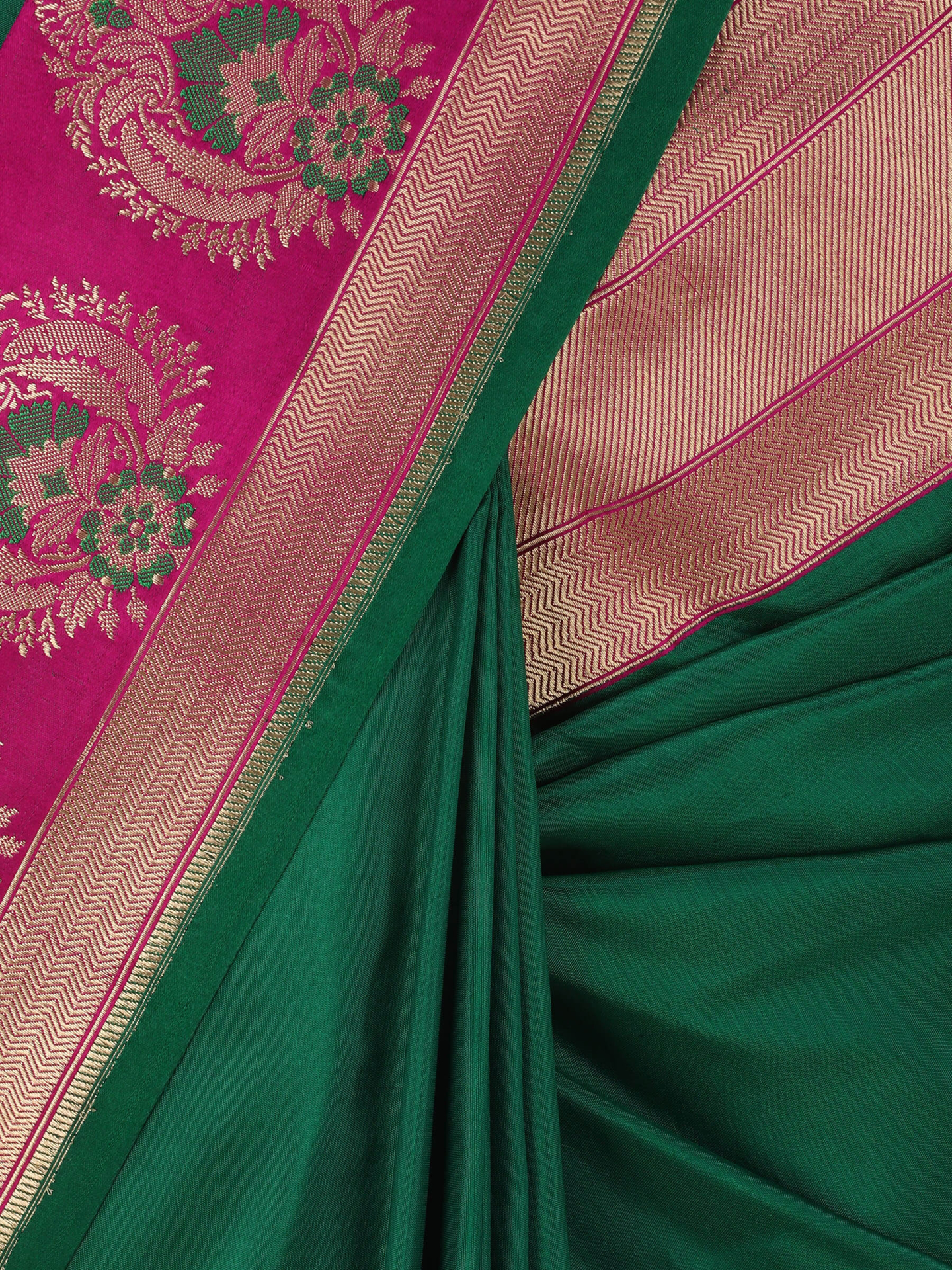 Green Mirpur katan saree with green and golden weaving on magenta paar and aanchal. Aanchal with fringe trim. Comes with matching unstitched blouse piece.