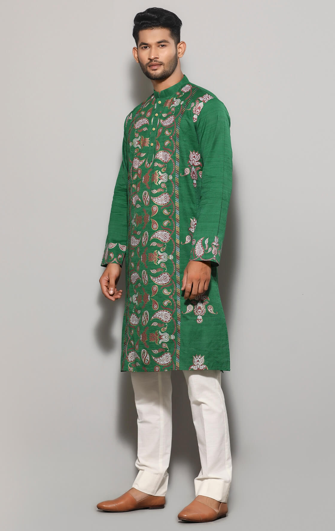 Green printed endi cotton panjabi with multicolour embroidery lines on both sides from shoulder to bottom.