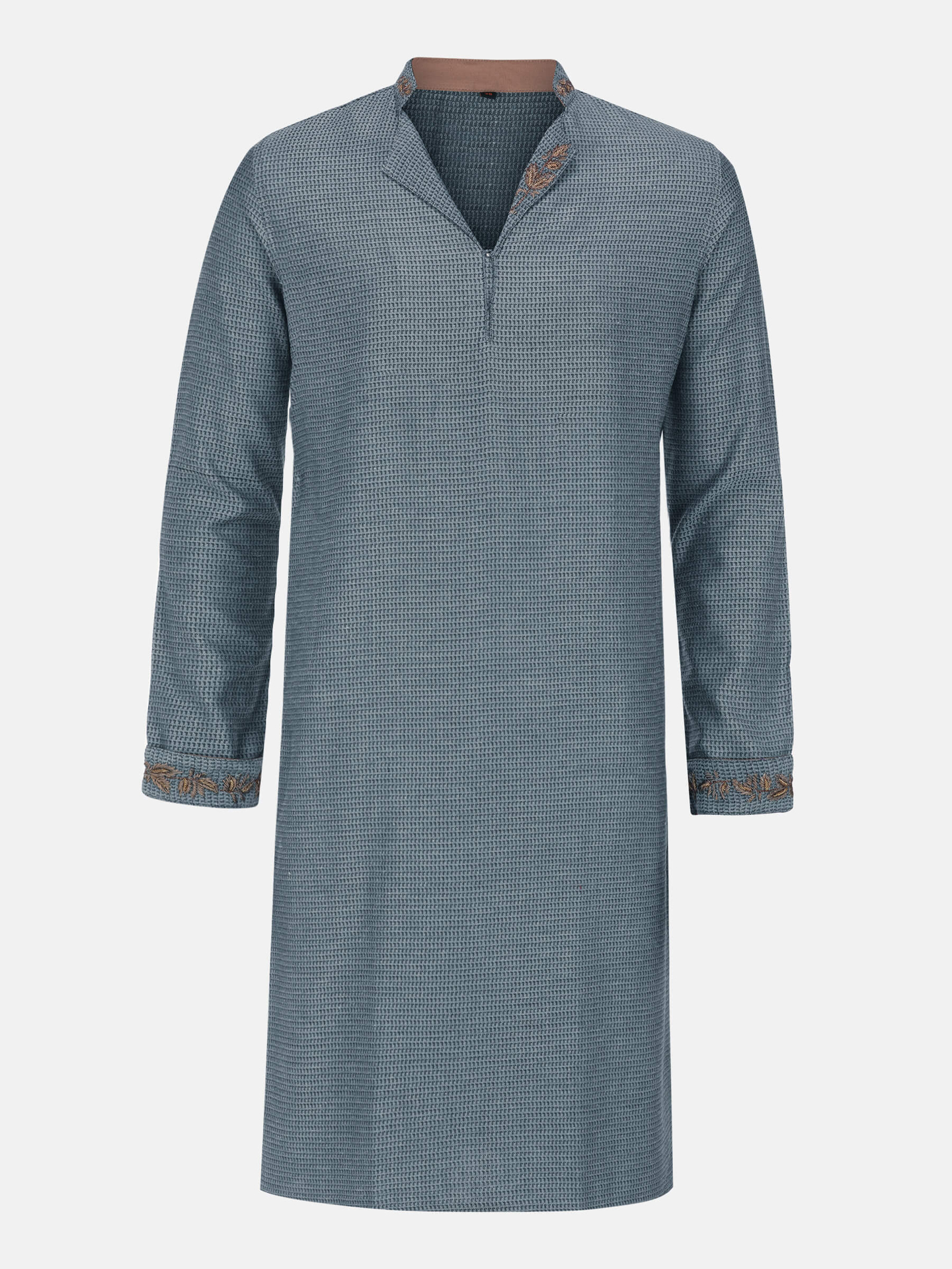 Grey textured viscose-cotton panjabi with golden erri embroidery. Comes with ivory cotton pajama. this panjabi useing very comfortable. made in bangladesh.