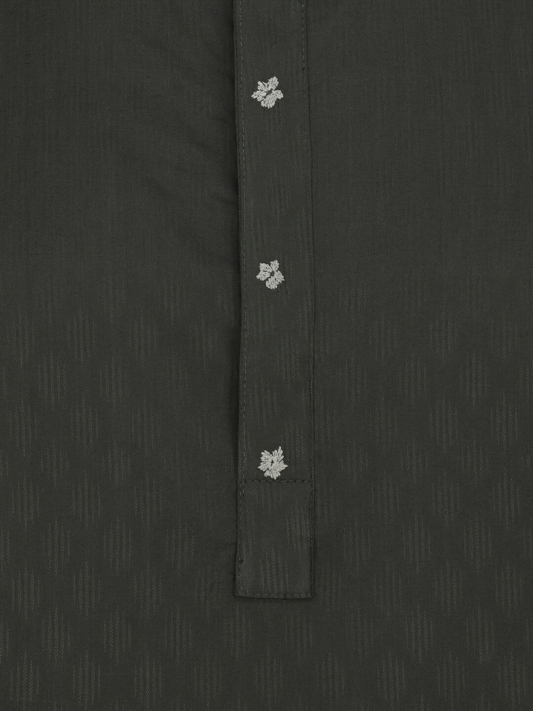 Grey viscose panjabi with embroidery and dual in-seam side pockets. Comes with ivory cotton linen pajama with drawstring and elastic waist.