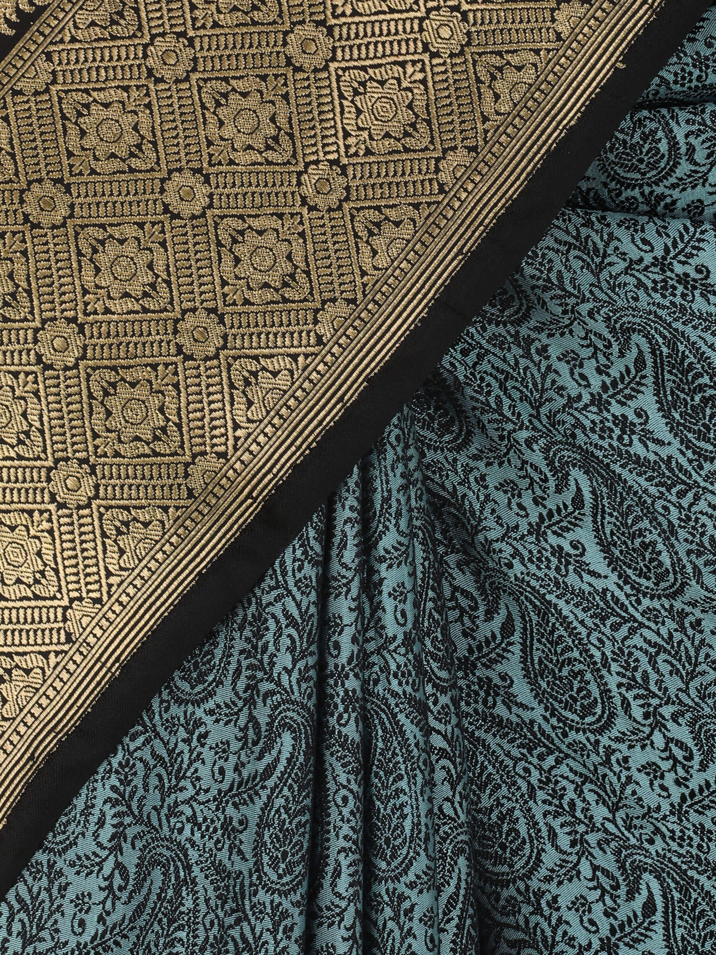Grey Mirpur katan saree with golden, silver, copper and black weaving. Aanchal with fringe trim. Comes with matching unstitched blouse piece.