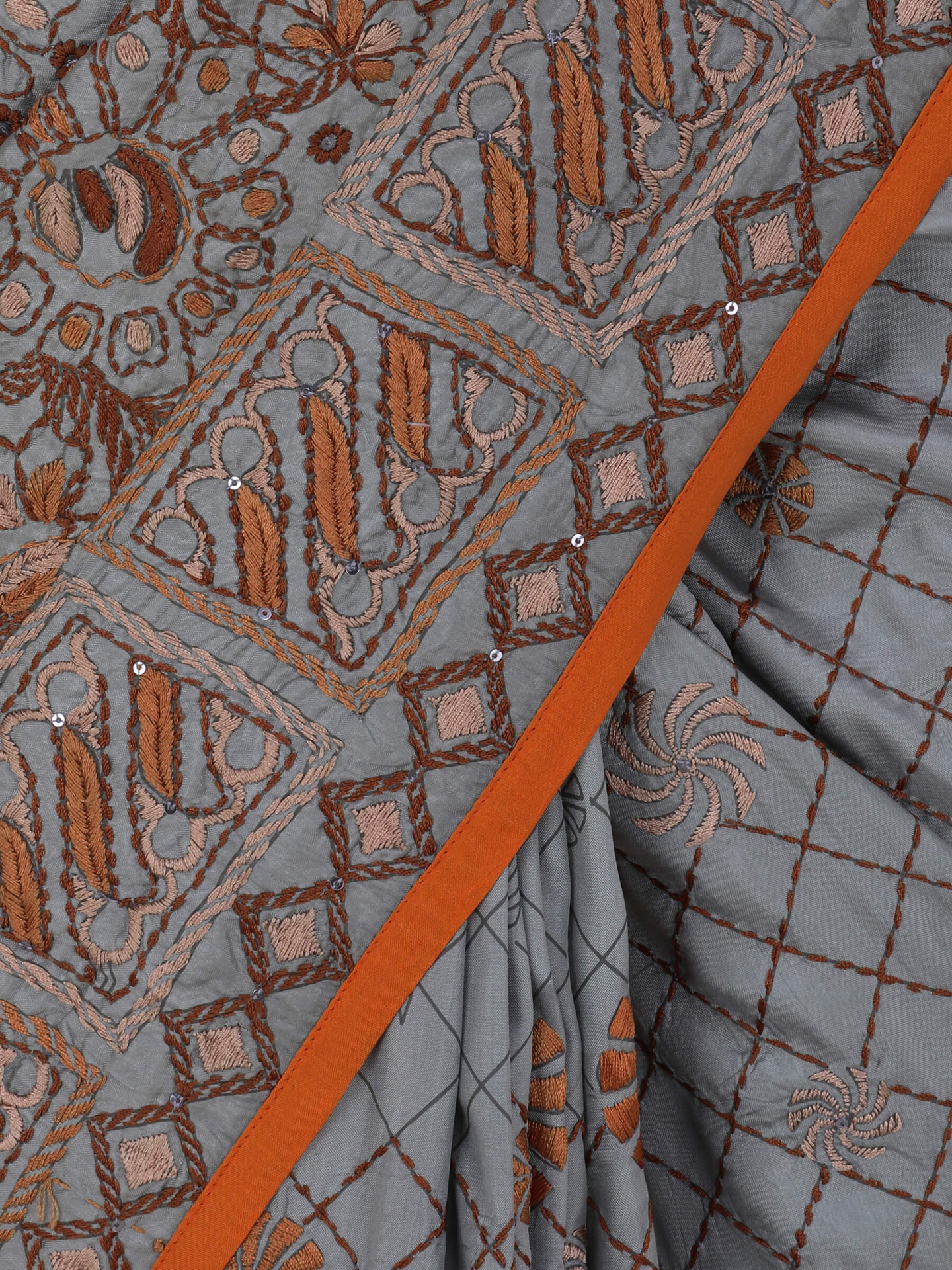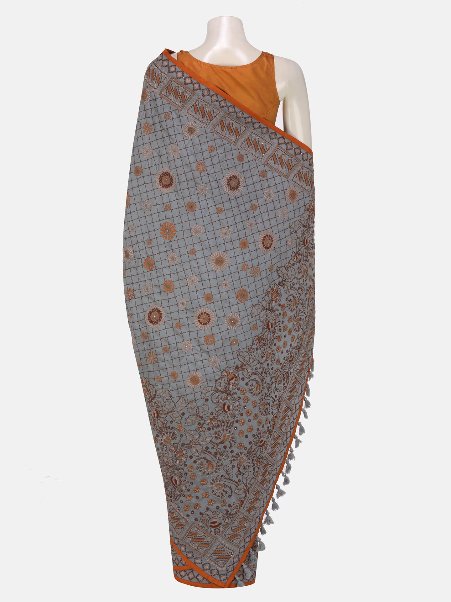 Grey silk saree with beige and brown Nakshi kantha embroidery. Aanchal with tassel trim. Comes with unstitched blouse piece.