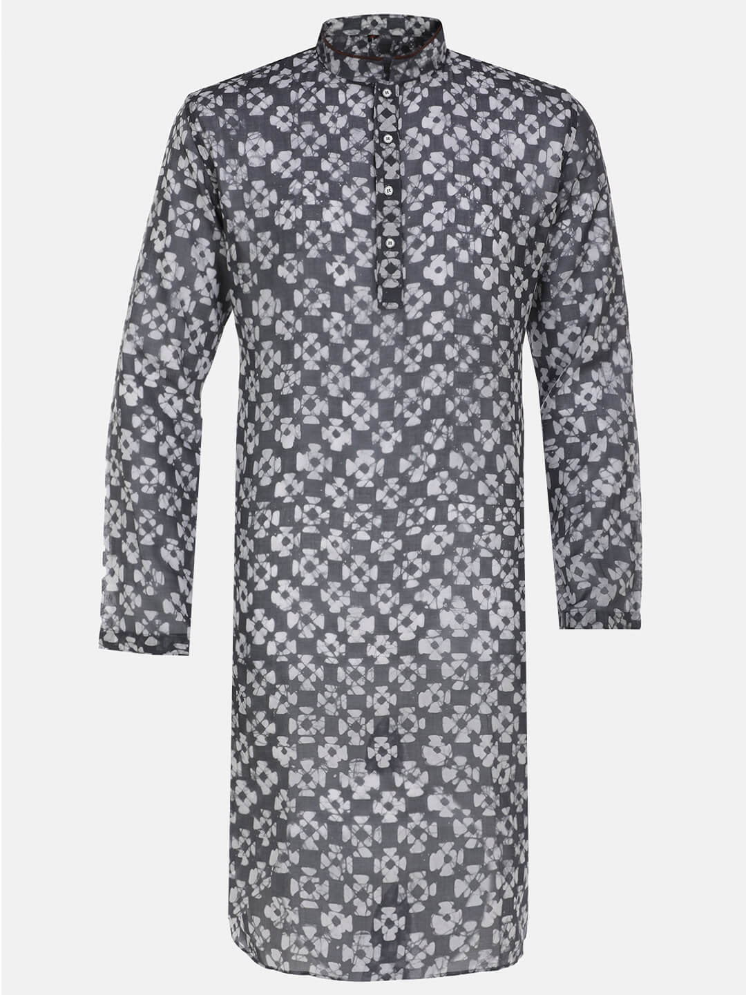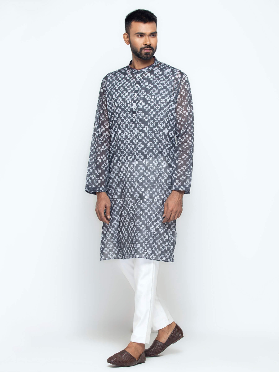 Grey addi cotton panjabi with white wax dyeing. Features in-seam side pockets. Pair with pajama, waistcoat and other accessories.