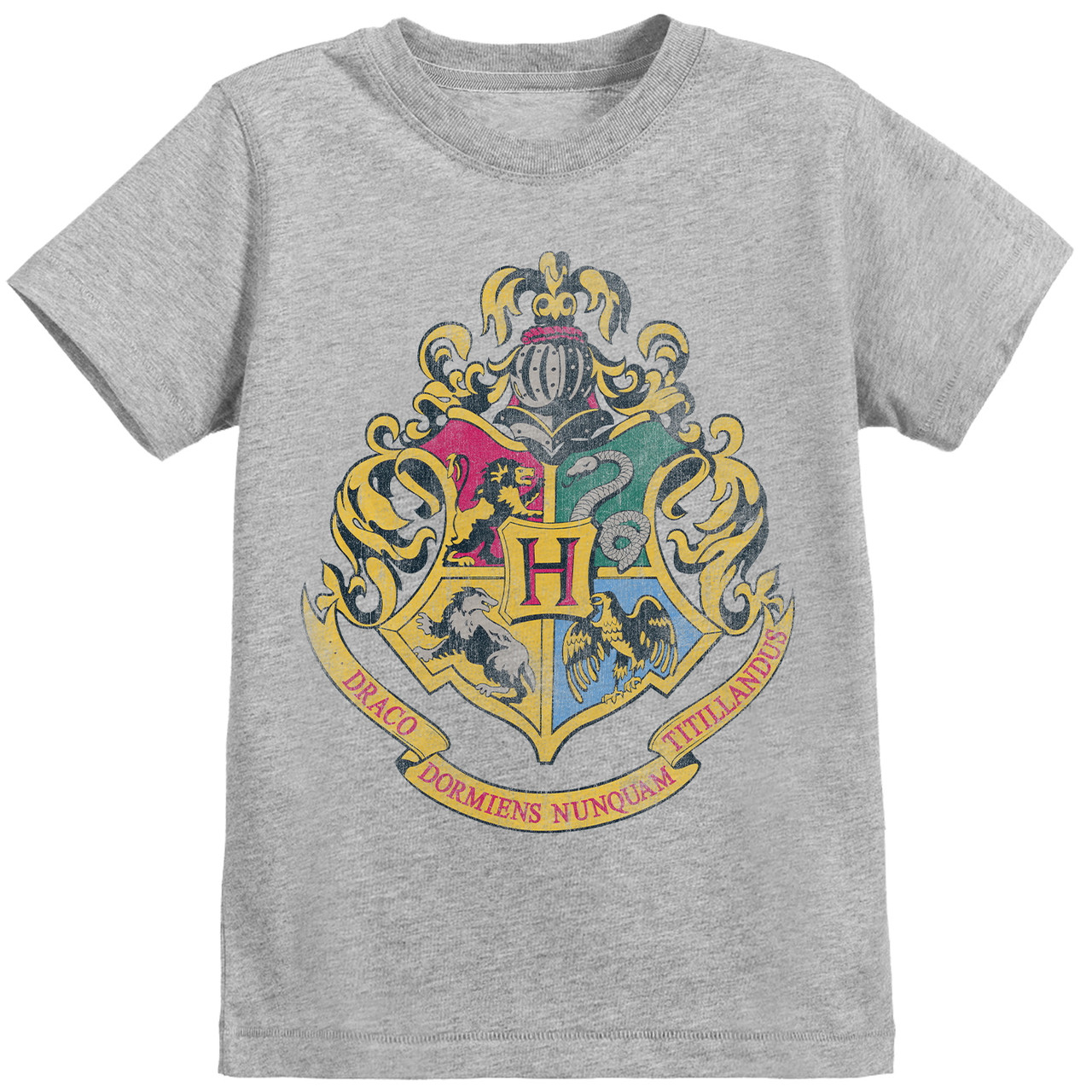 Brand: 100% Official Harry Potter Distressed Hogwarts Crest T-Shirt printed on high quality cotton blend garment Neckline: Crew Neck Fit: Regular Fit Sleeve Type: Short Sleeve Material: Cotton Blend Colour: Grey Garment Garment Care: Machine Washable