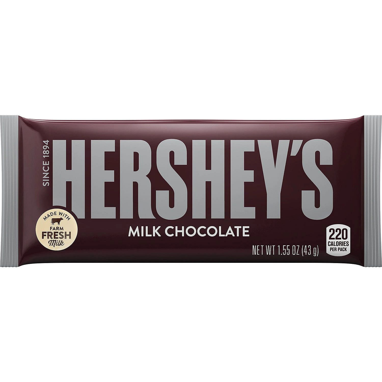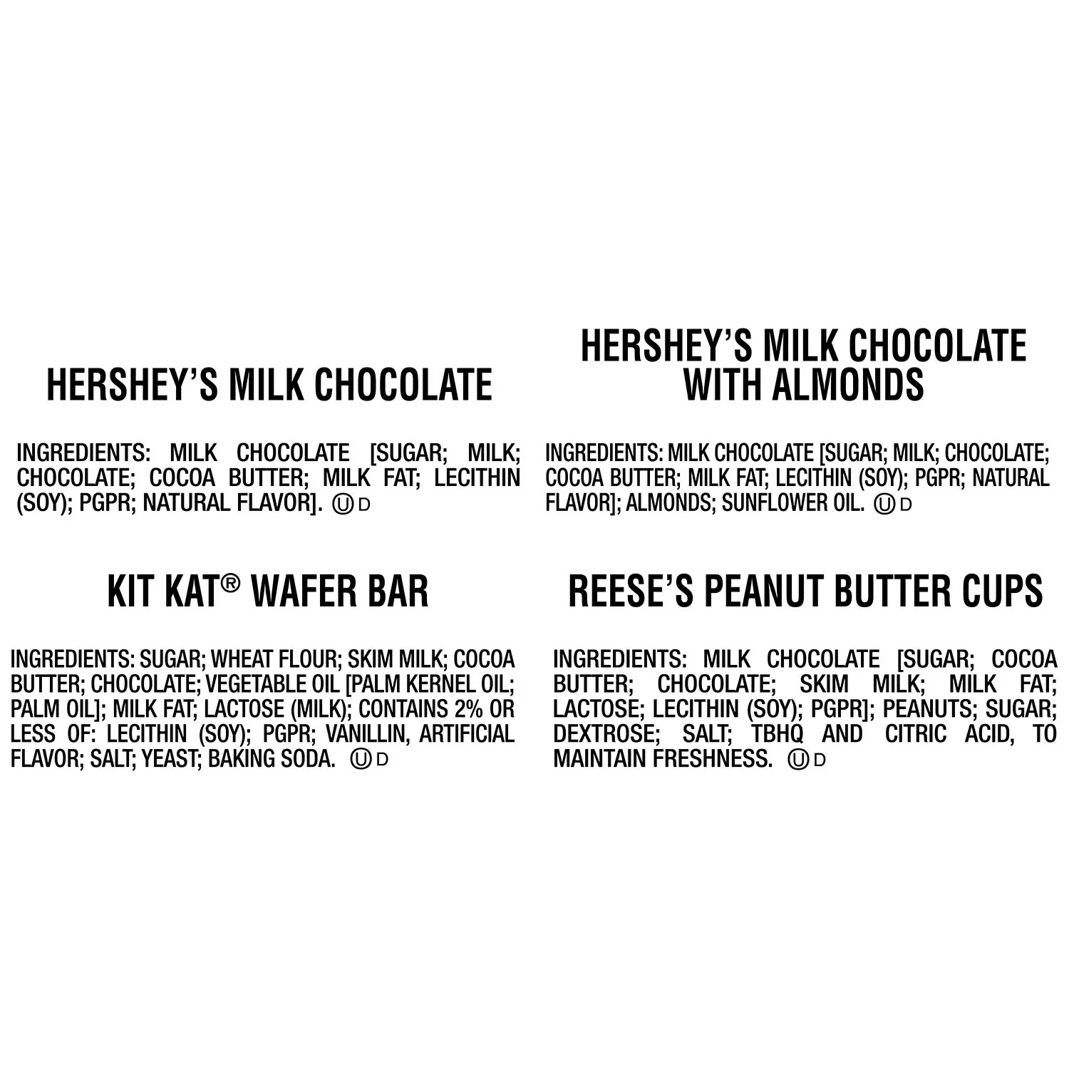 Satisfy a chocolate craving with a full-size Hershey's candy bar from the Hershey's Full-Size Variety Pack. There's something for just about everyone in this 45-ounce assortment. It offers 30 chocolate bars, which include Kit-Kat, Reese's Peanut Butter Cups, Hershey's Milk Chocolate and Hershey's Milk Chocolate with Almonds.