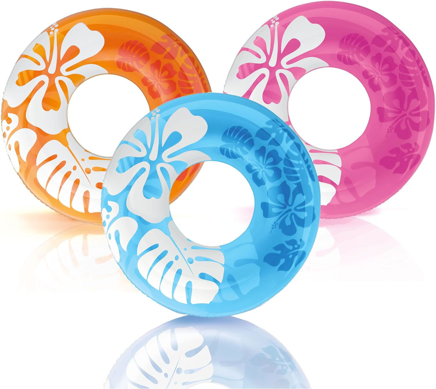 Great for swimming pools and the beach, the Intex Clear Color Tube adds to the fun of water play. This 36-inch diameter inflatable tube features a fun and colorful design. Comes with 24 inflatable pool ring floats. These swim tubes are ideal for floating, swimming, or playing within the pool. Designed with flower graphics printed on 3 assorted color choices: blue, orange, and pink. Add some fun under the sun this summer with these inflatable inner tubes.
