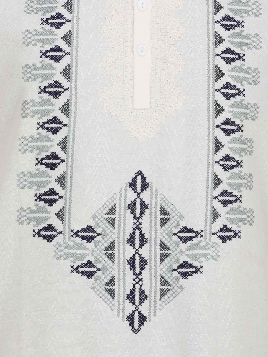 Ivory viscose-cotton slim fit panjabi with black and grey embroidery. Features in-seam pockets. Pair with pajama, waistcoat and other accessories.