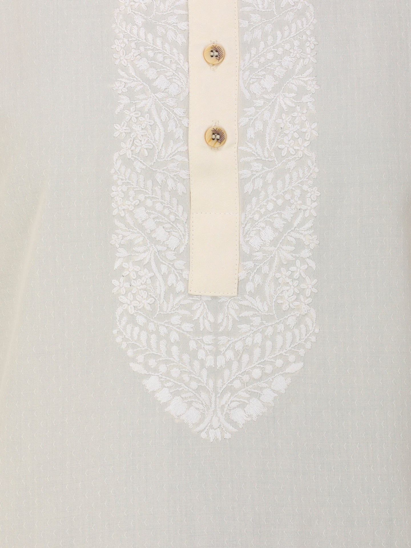 Ivory viscose panjabi with white embroidery on front and back. this panjabi useing very comfortable. made in bangladesh.
