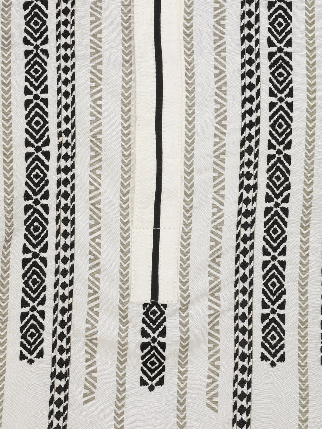 Ivory printed joysree silk panjabi. Features black embroidery and dual in-seam side pockets. Try yours with panjabi, waistcoat and other accessories.