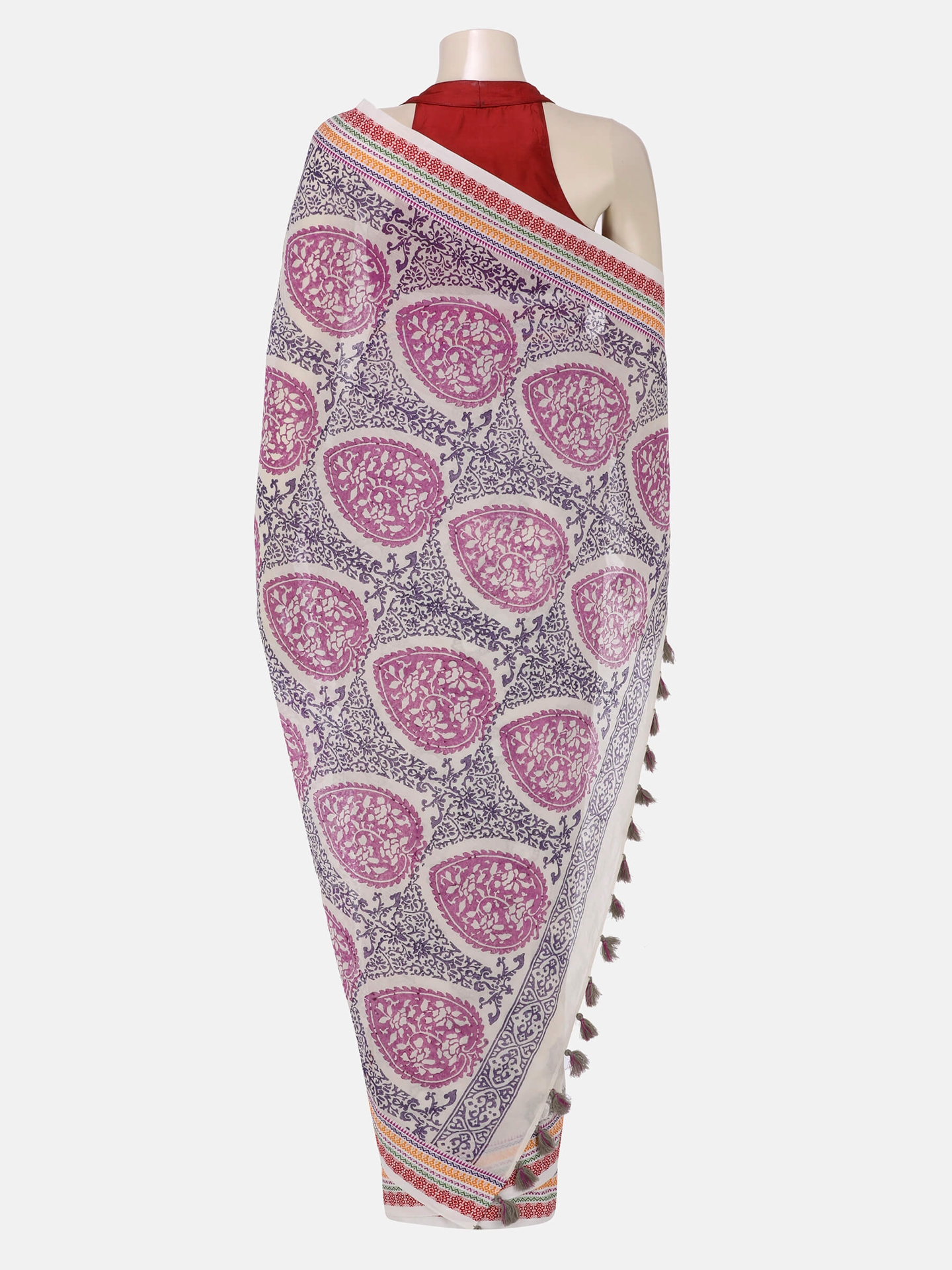 Ivory cotton saree with mauve, purple, grey and white print and multicolour weaving. Aanchal with tassel trim. Comes with matching unstitched blouse piece.