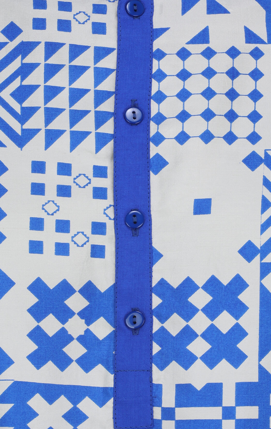 Ivory silk panjabi with blue prints and in seam pocket. Comes with white cotton pajama with drawstring, button fly and elastic waist.