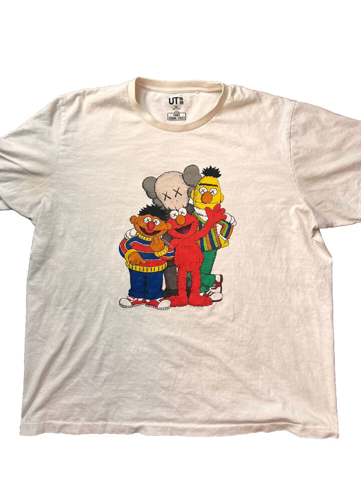 The KAWS x Uniqlo x Sesame Street Group Tee White's front showcases a graphic of the central characters of the children's TV show, Sesame Street, reimagined in the KAWS' signature design. The critical characters featured on this printed graphic may include Elmo, Ernie, and Bert, giving this garment a fun-loving look. The garment is crafted from sturdy materials; polyester and cotton for a breathable and comfortable feel.