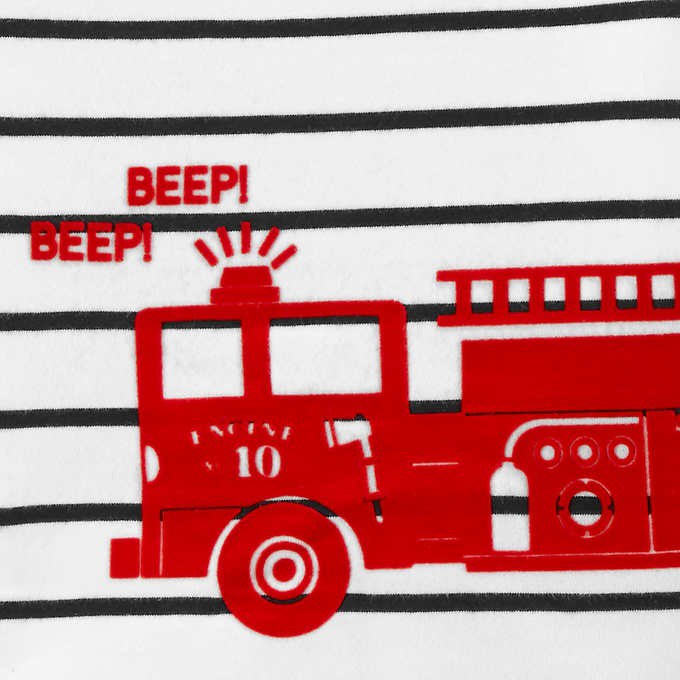 Black and white striped short sleeve shirt with red firetruck printed on it