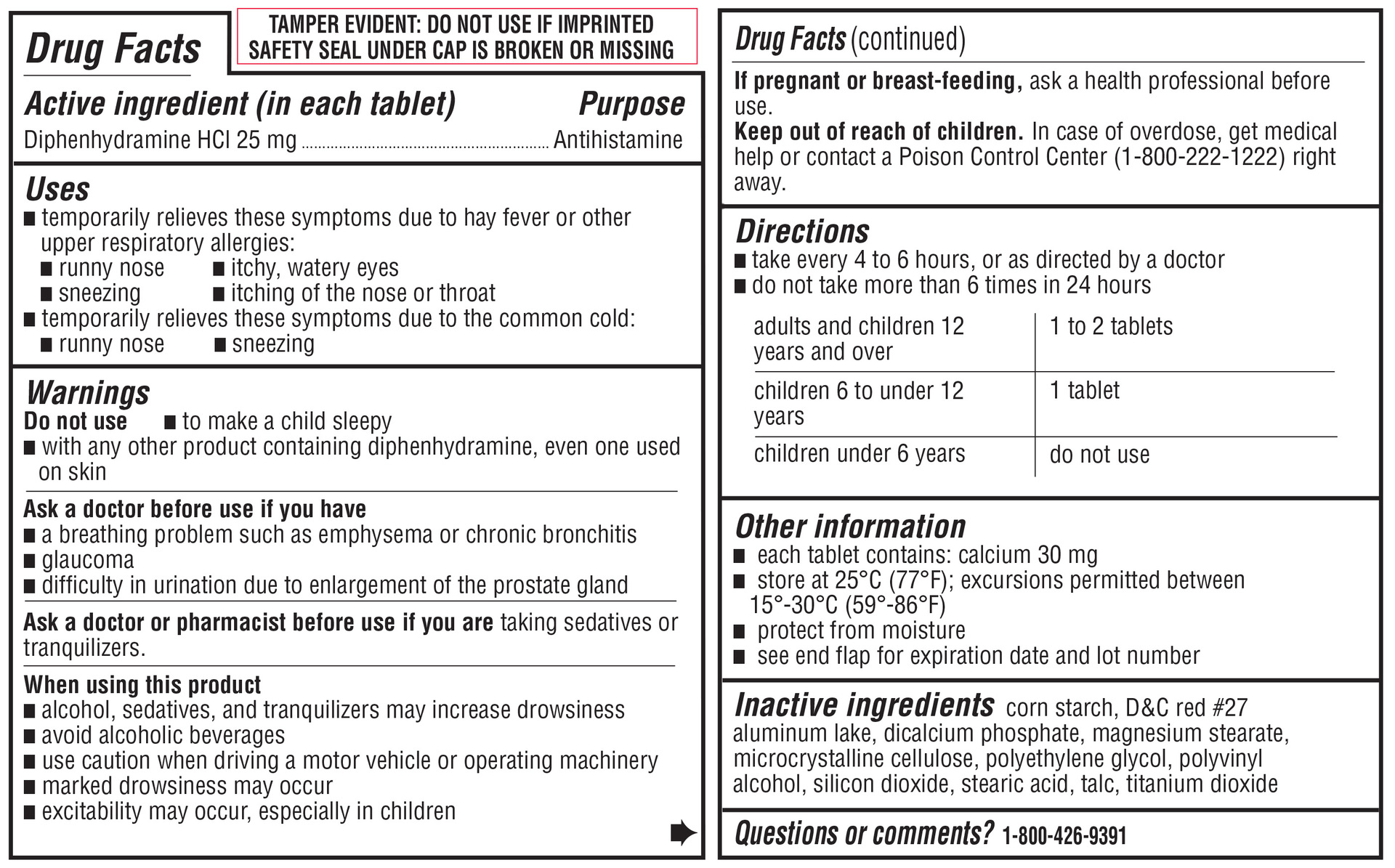 Antihistamine Allergy Relief.It contains Diphenhydramine HCl 25mg. Compare to Benadryl Allergy Ultratab. Kirkland Signature Allergy Medicine Tablets active ingredient is Diphenhydramine 25mg, an easy to swallow antihistamine that relieves sneezing, runny nose, itchy throat, watery eyes, and other allergy symptoms in adults and children 12 years and older. Antihistamines temporarily reduce the effects of the natural chemical histamine in the body and the symptoms caused by hay fever and other upper respiratory allergies.
