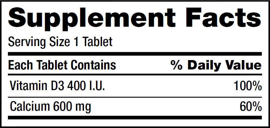 Suggested Use: Take one tablet two times daily, preferably with a meal. Ingredients: Calcium Carbonate, Cellulose Gel, Maltodextrin, Croscarmellose Sodium, Magnesium Stearate, Titanium Dioxide (artificial color), Polyethylene Glycol, Triethyl Citrate, Polysorbate 80, Corn Starch, Gelatin, Yellow 6 Lake, Vitamin D3 (Cholecalciferol). CAUTION: If you are pregnant, nursing, or taking any medications, consult your doctor before use. Discontinue use and consult your doctor if any adverse reactions occur. No Artificial Flavors. No Preservatives. No Yeast or Gluten. Keep out of the reach of children. Store at room temperature, tightly closed. Avoid excessive heat. | |