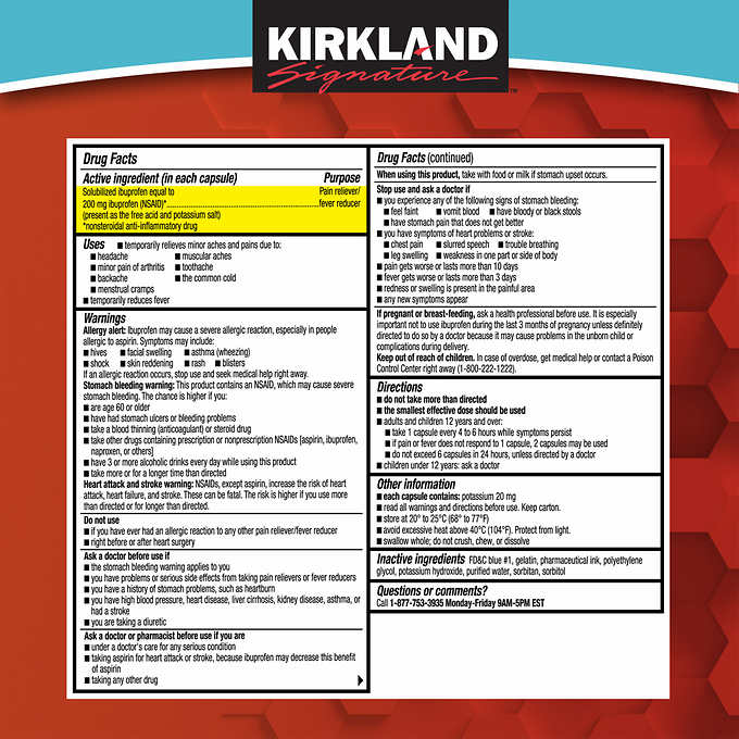 The active ingredient in each capsule of Kirkland Signature ibuprofen is solubilized ibuprofen equal to 200 mg ibuprofen (NSAID — nonsteroidal anti-inflammatory drug). When taken as directed, ibuprofen temporarily relieves minor aches and pains due to: