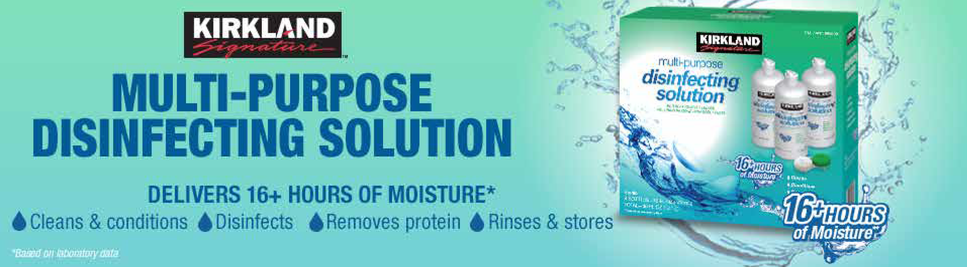 When used daily, Kirkland Multi-Purpose Solution dissolves protein and cleans, loosens and removes accumulations of film, debris and deposits from soft and silicone hydrogel contact lenses. Kirkland Multi-Purpose Solution helps prevent the formation of irritating deposits on the lens surface. It kills harmful microorganisms on the lens. While your lens is soaking, the formula envelops the lens in a moisture-rich cushion to help the lens remain comfortable throughout the day. Kirkland Multi-Purpose Solution can also be used to rinse lenses. Kirkland Multi-Purpose Solution is not approved as a rewetting drop for direct in the eye use. If any debris remains on contact lenses, rinse with Kirkland Multi-Purpose Solution prior to insertion.