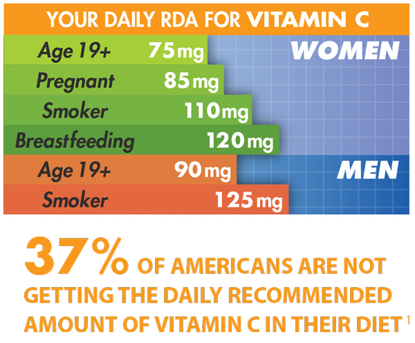 Multiple factors, including age, gender, life stage and smoking status, affect the amount of vitamin C a person needs.1 Therefore, the Institute of Medicine’s Recommended Dietary Allowance (RDA) for vitamin C varies slightly between men and women of different life stages and conditions.The levels are higher for smokers due to the increased oxidative stress they experience.1 The levels are higher for pregnant and breastfeeding women to address the increased needs of mother and baby
