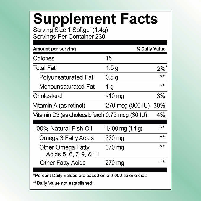 - One soft gel contains 330 mg of Omega-3 fatty acids (230 mg EPA+DHA combined)