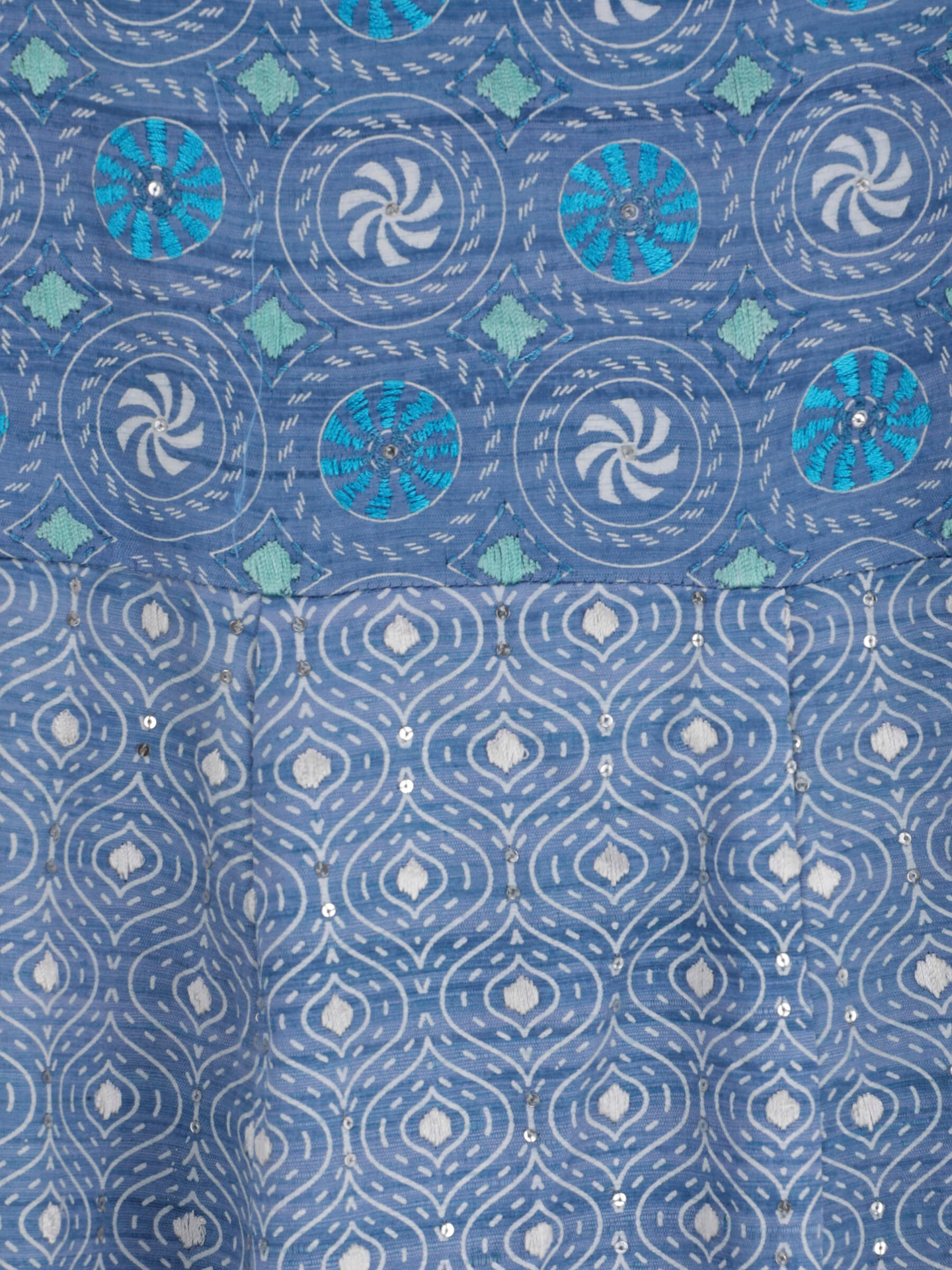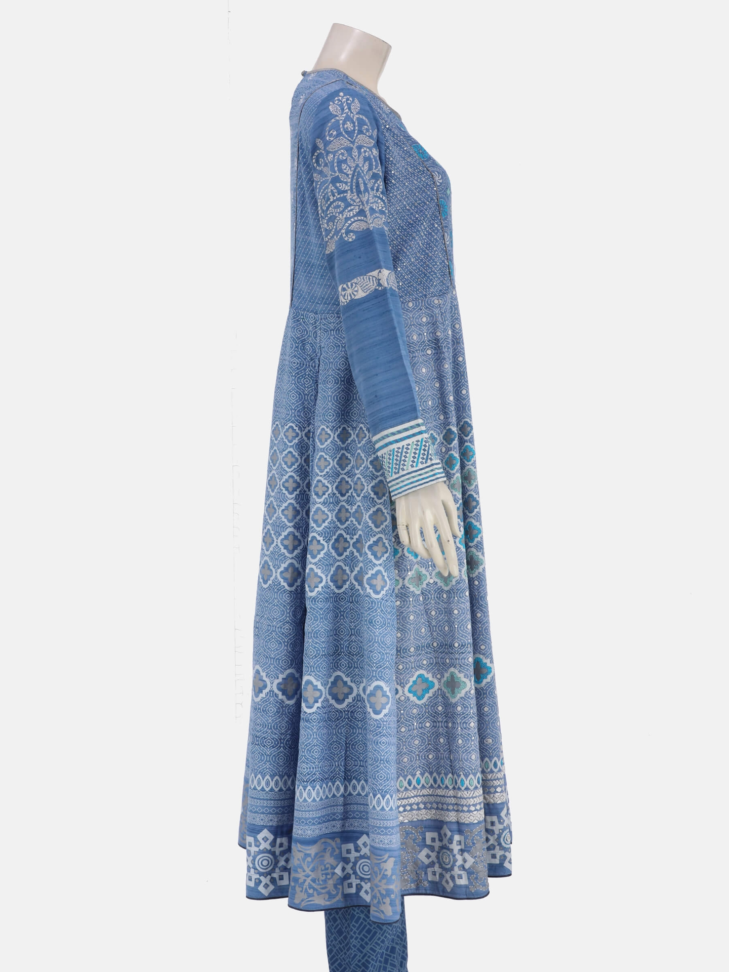 Light blue brush painted viscose-cotton kameez with multicolour embroidery over white prints. Comes with brush painted and printed joysree silk shalwar and mixed muslin dupatta.